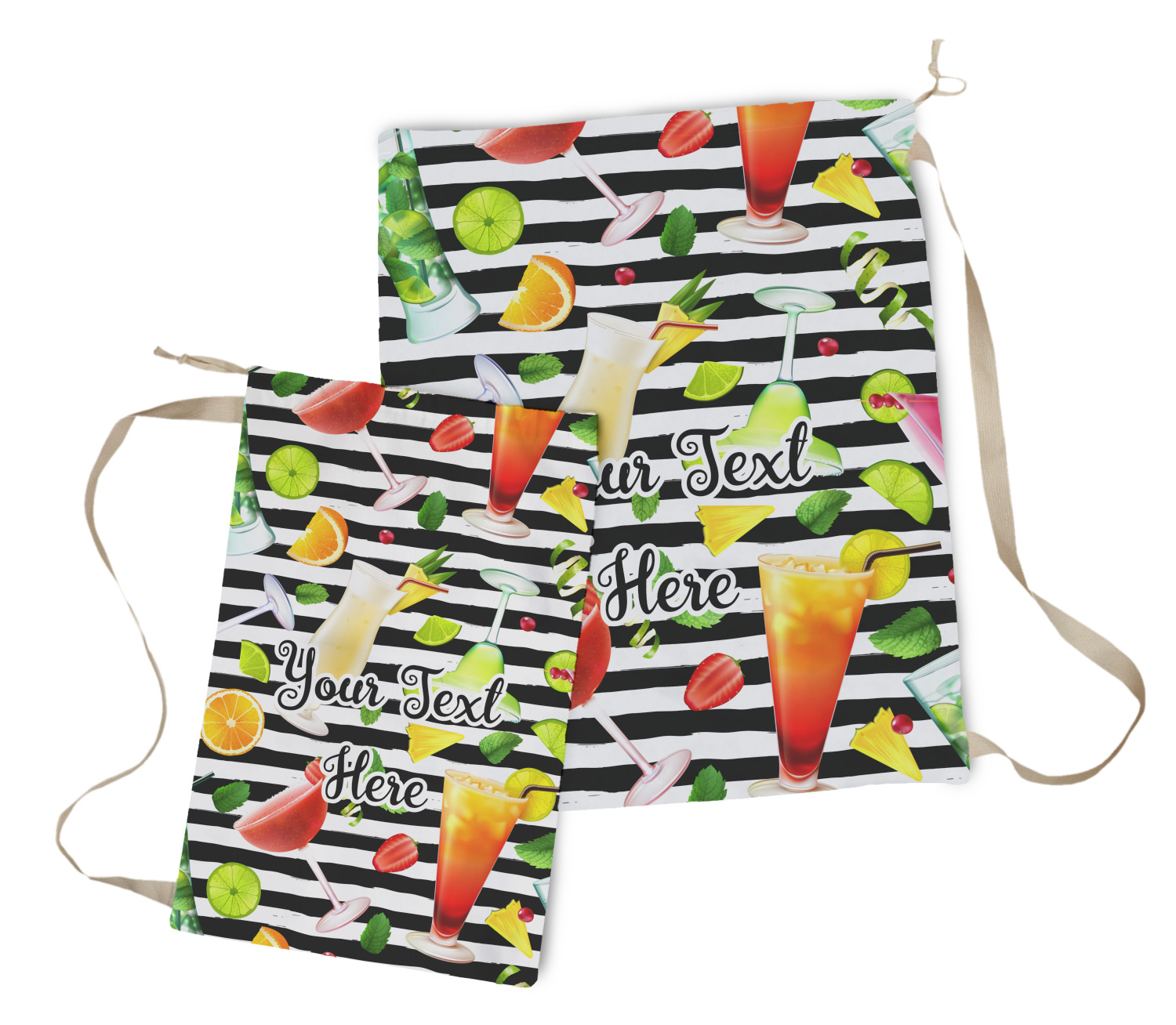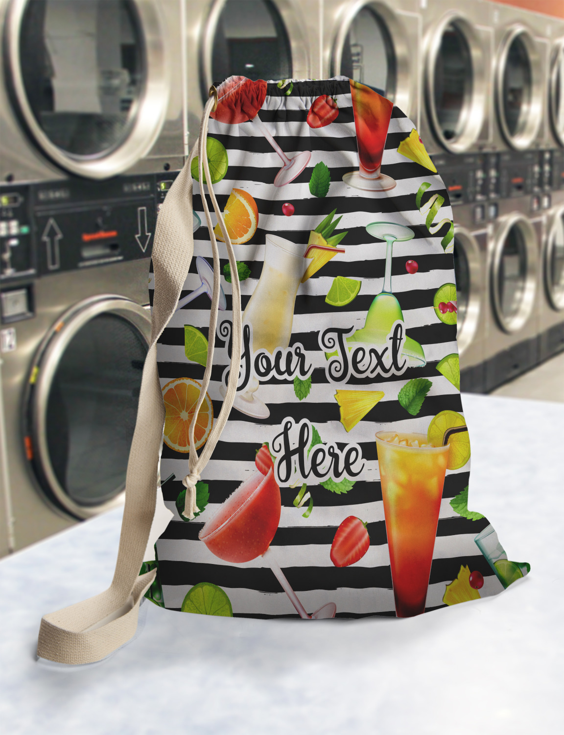 Carry your laundry in style with these customized laundry bags. Available in two sizes, featuring a natural colored woven strap and a cinch cord, these bags hold a lot of clothes or anything else you want to fit in them.