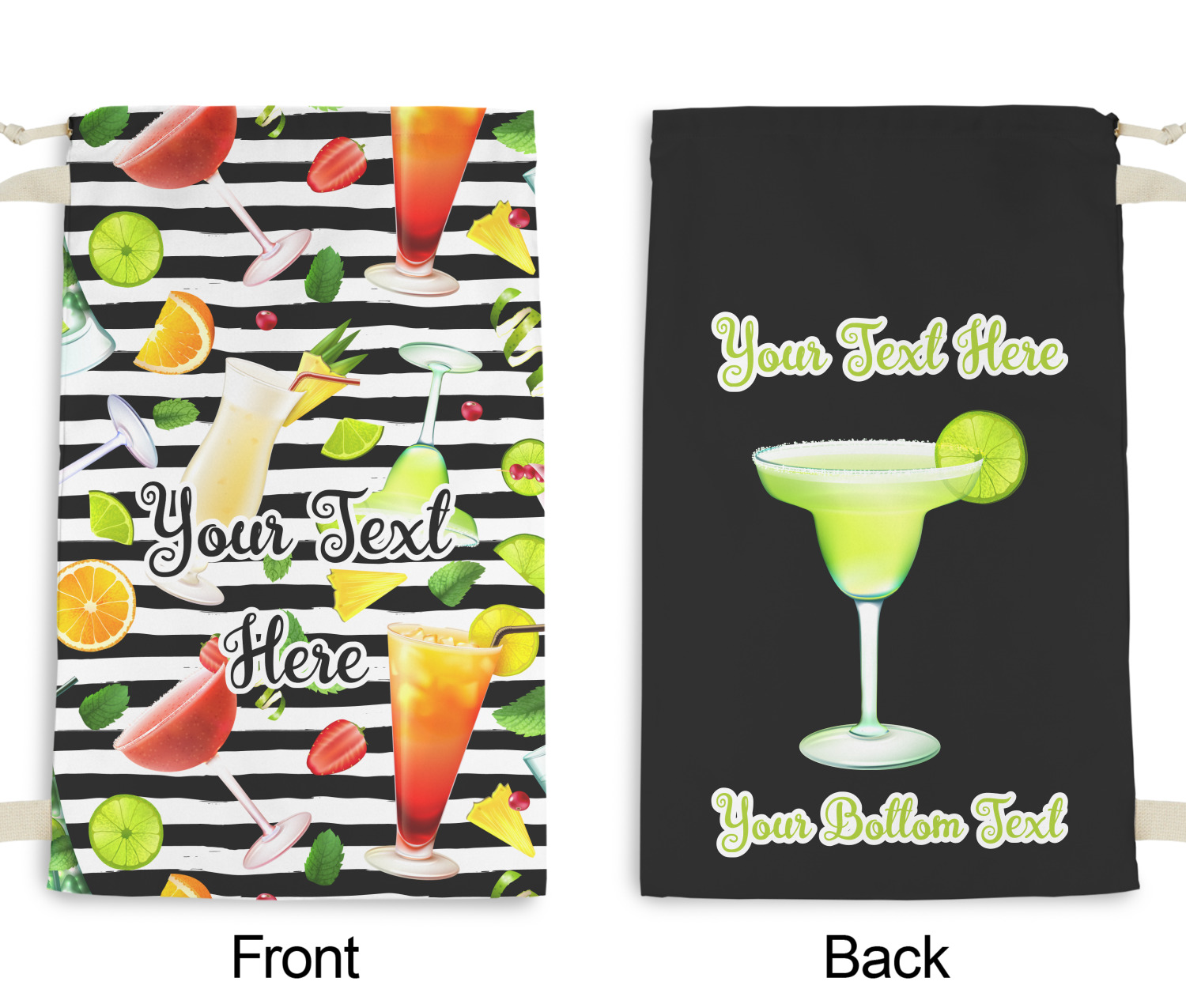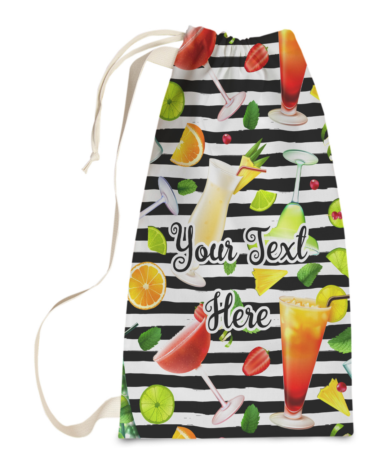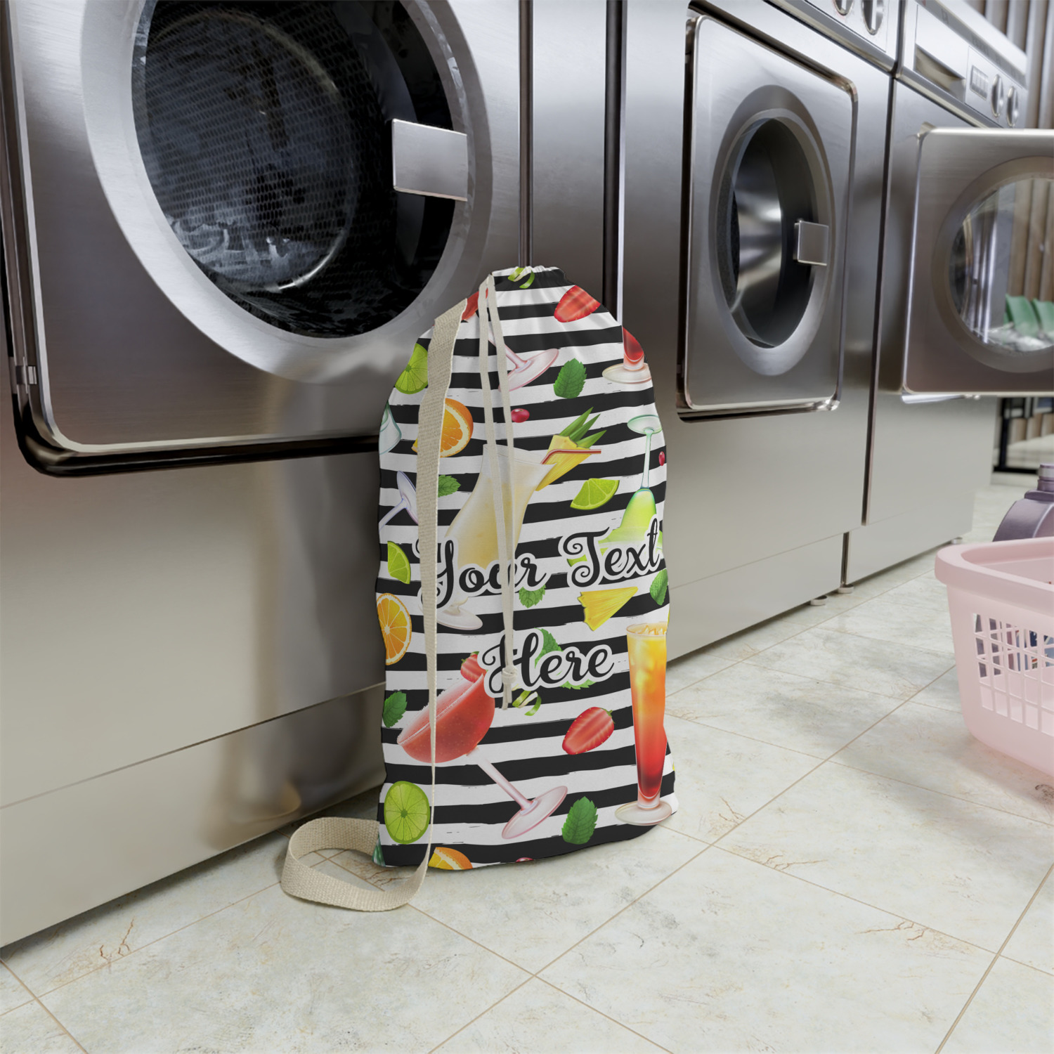 Carry your laundry in style with these customized laundry bags. Available in two sizes, featuring a natural colored woven strap and a cinch cord, these bags hold a lot of clothes or anything else you want to fit in them.