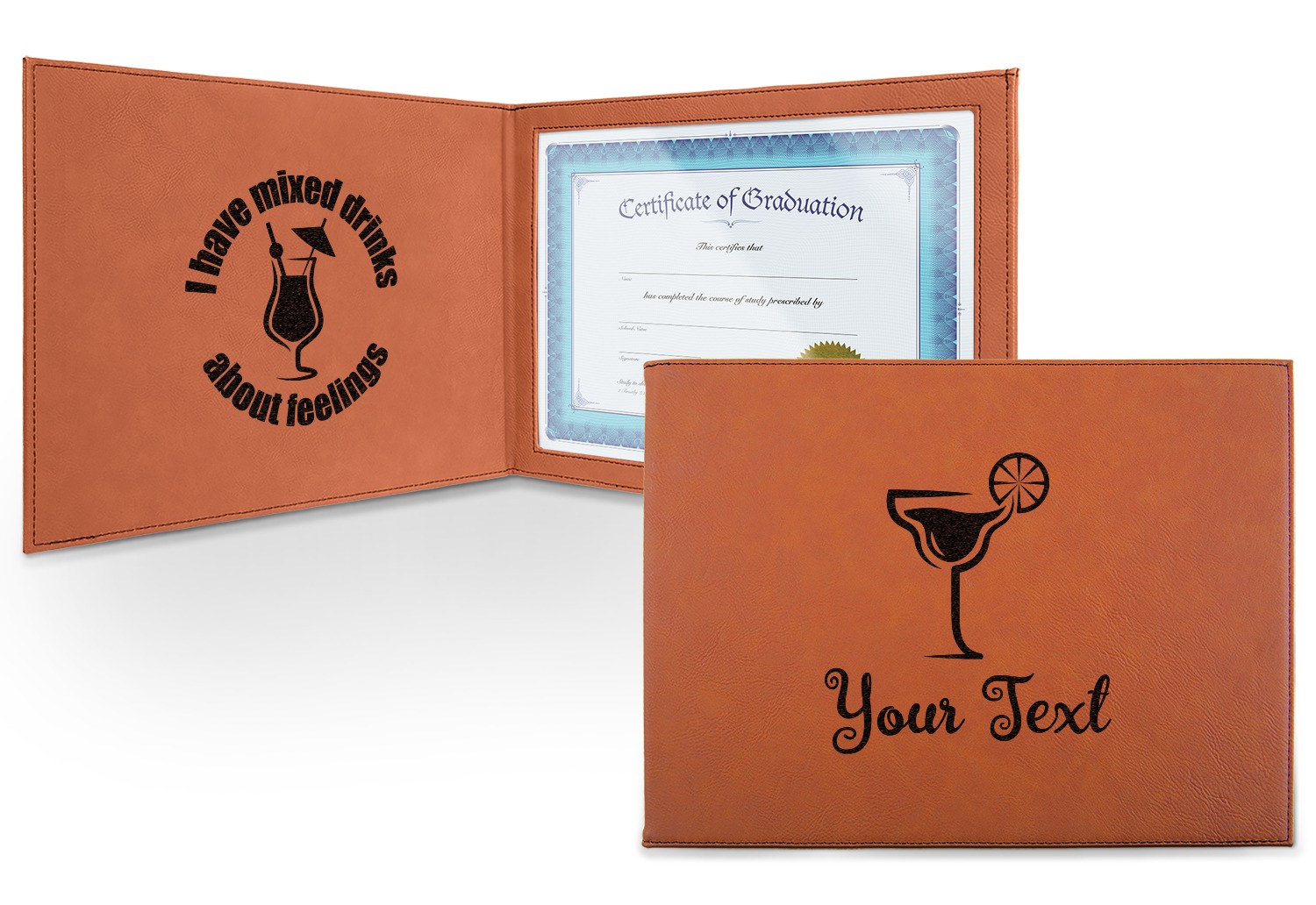 This cognac-colored, leatherette certificate jacket is the ideal way to display or store your hard-earned certificate. When closed, the custom certificate holder measures at 12 by 9 inches. The interior of the certificate cover includes a clear, vinyl window to encase your diploma. The window measures at around 10.5 by 7.5 inches and can accommodate a diploma that measures at up to 8.5 by 11 inches. You can either choose to have your customization laser engraved on the front and interior, or solely the front.