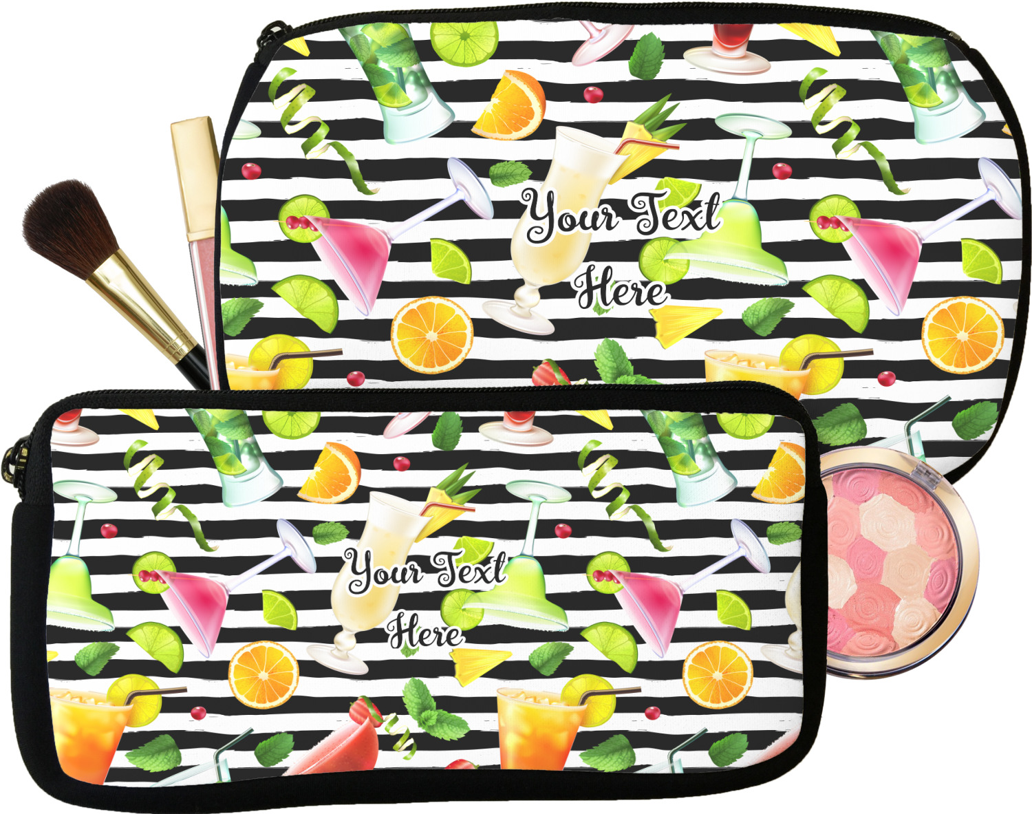 Our personalized makeup bags are available in many different designs, patterns and colors - so you are sure to find one that will love. They are made of neoprene (same material as wet-suits) and thus are water resistant, so spillages in your makeup bag will not end up all over you purse. They are customized on one side and are black on the other side and the zipper is black as well.