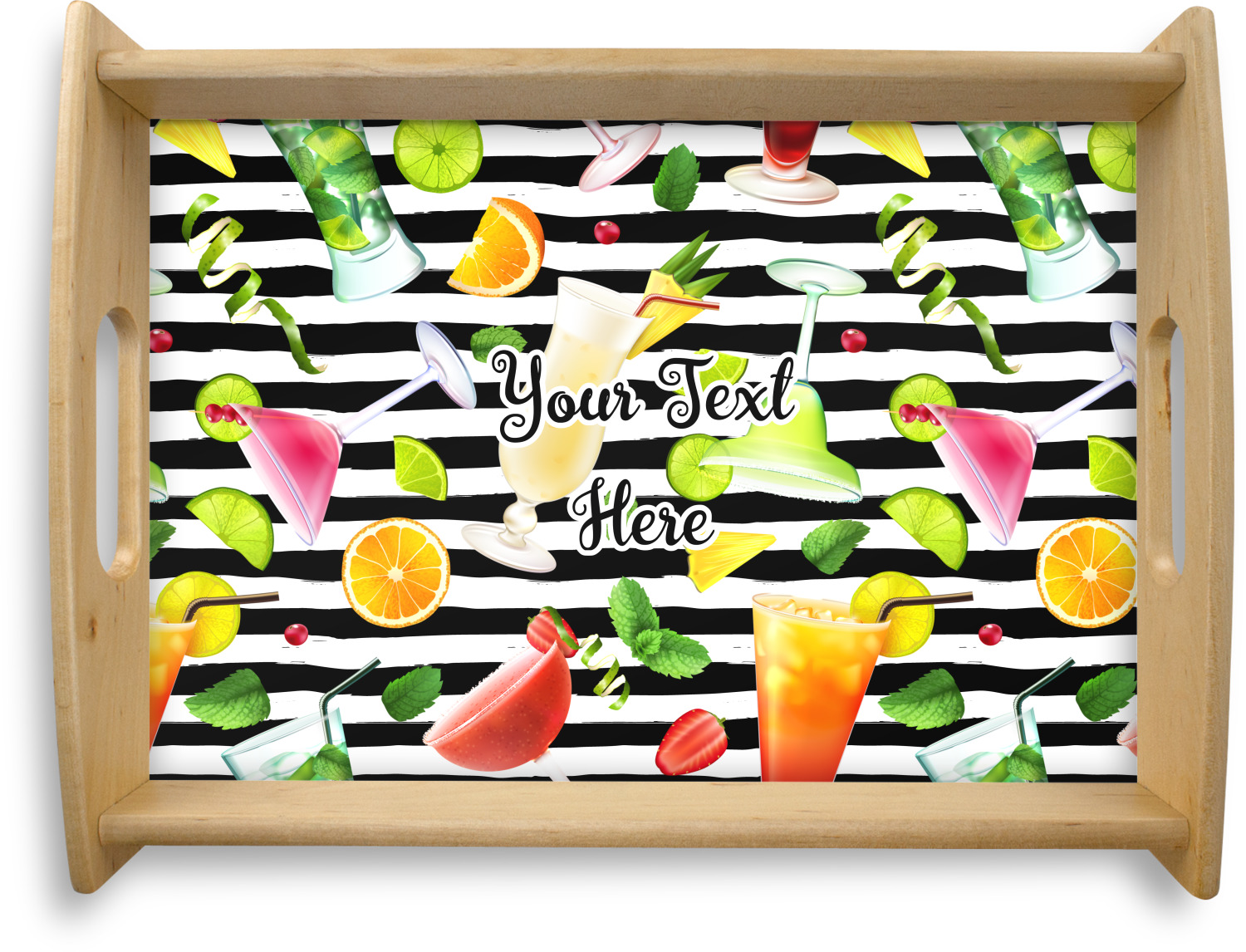 This serving tray with handles features square edges and two rounded sides, creating a very modern look. Each side is fabricated from a beautifully cut, natural wood. The bottom of the interior of the tray displays your customized design in bright, vibrant color. The tray is sold in both a black color and a natural wood look. Each variation of the wood serving tray has two sizes: Small, which is 14" x 10" x 2.25", and Large, which is 19.5" x 13.5" x 2.75".