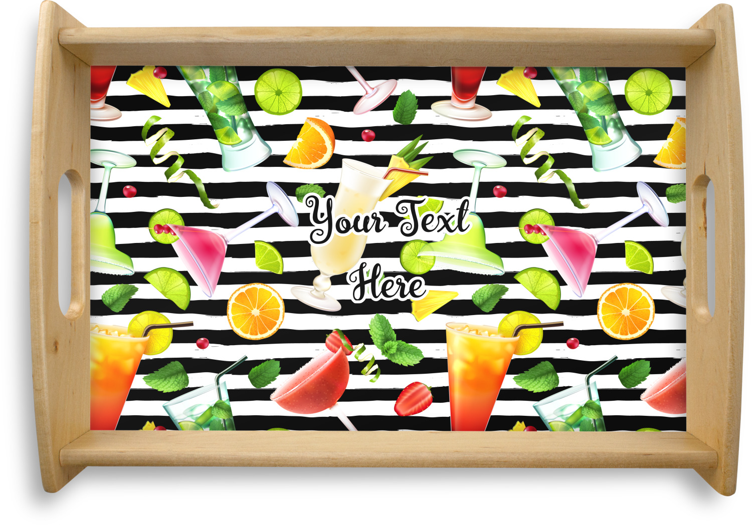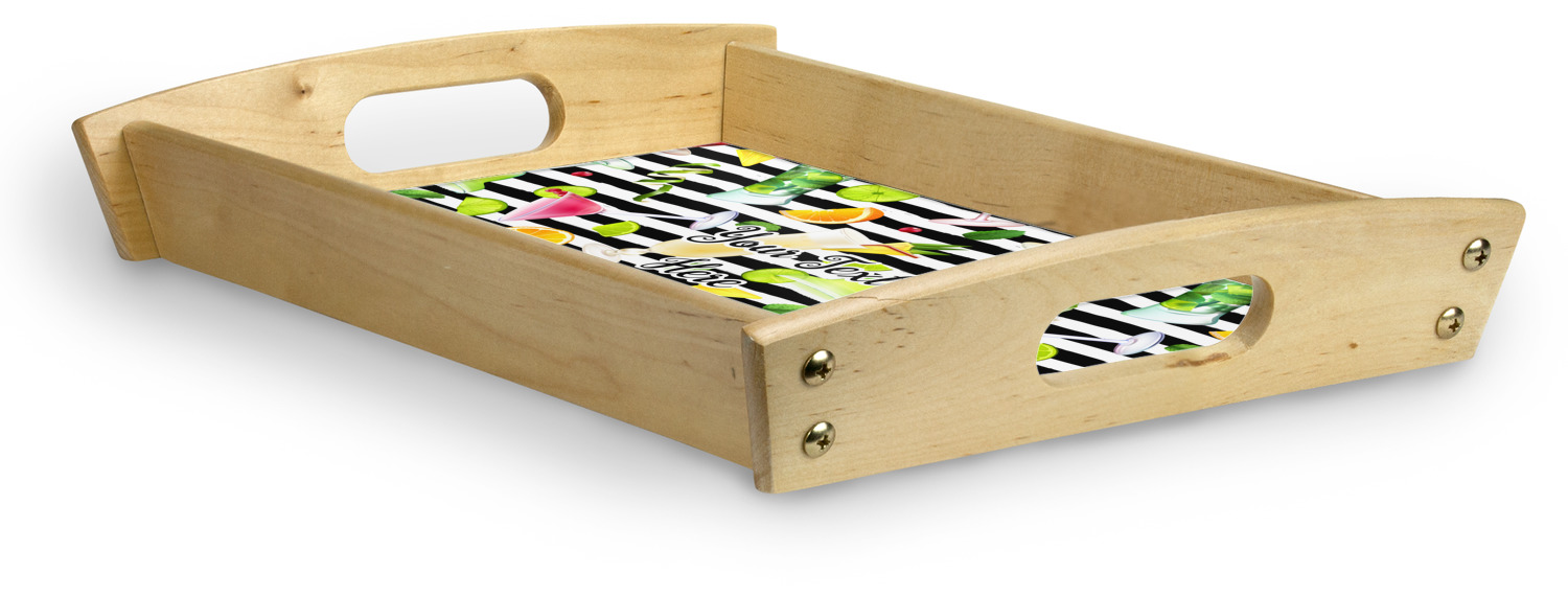 This serving tray with handles features square edges and two rounded sides, creating a very modern look. Each side is fabricated from a beautifully cut, natural wood. The bottom of the interior of the tray displays your customized design in bright, vibrant color. The tray is sold in both a black color and a natural wood look. Each variation of the wood serving tray has two sizes: Small, which is 14" x 10" x 2.25", and Large, which is 19.5" x 13.5" x 2.75".