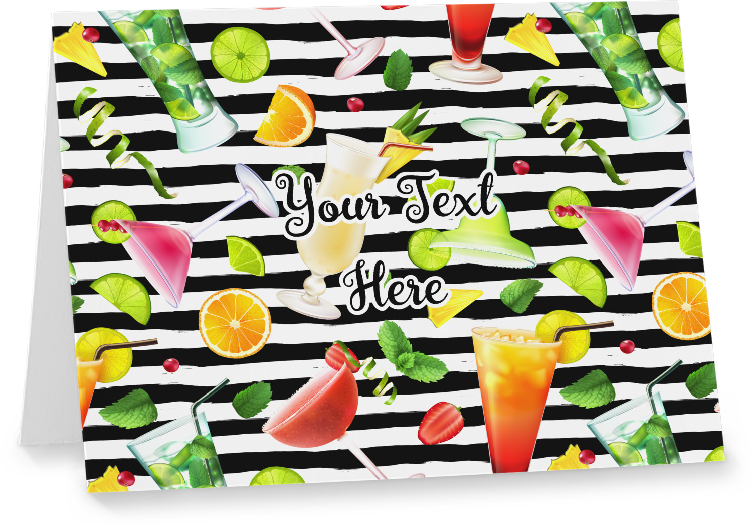 This design has gorgeous illustrations of several different kinds of mixed drinks from mojitos to margaritas. They're are a variety of colors like pink, orange, green, yellow, black, and white. Behind the cocktails is a fun striped pattern giving it a bit of pizazz. You are able to personalize the text with a name, monogram, or whatever you like.