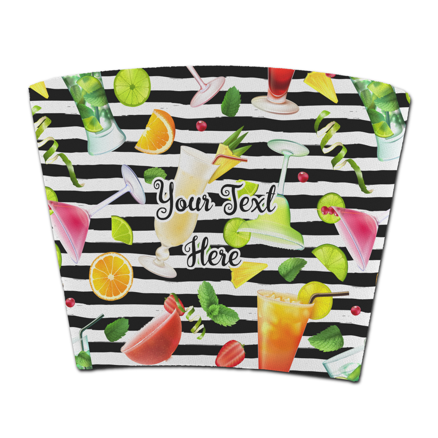 This design has gorgeous illustrations of several different kinds of mixed drinks from mojitos to margaritas. They're are a variety of colors like pink, orange, green, yellow, black, and white. Behind the cocktails is a fun striped pattern giving it a bit of pizazz. You are able to personalize the text with a name, monogram, or whatever you like.