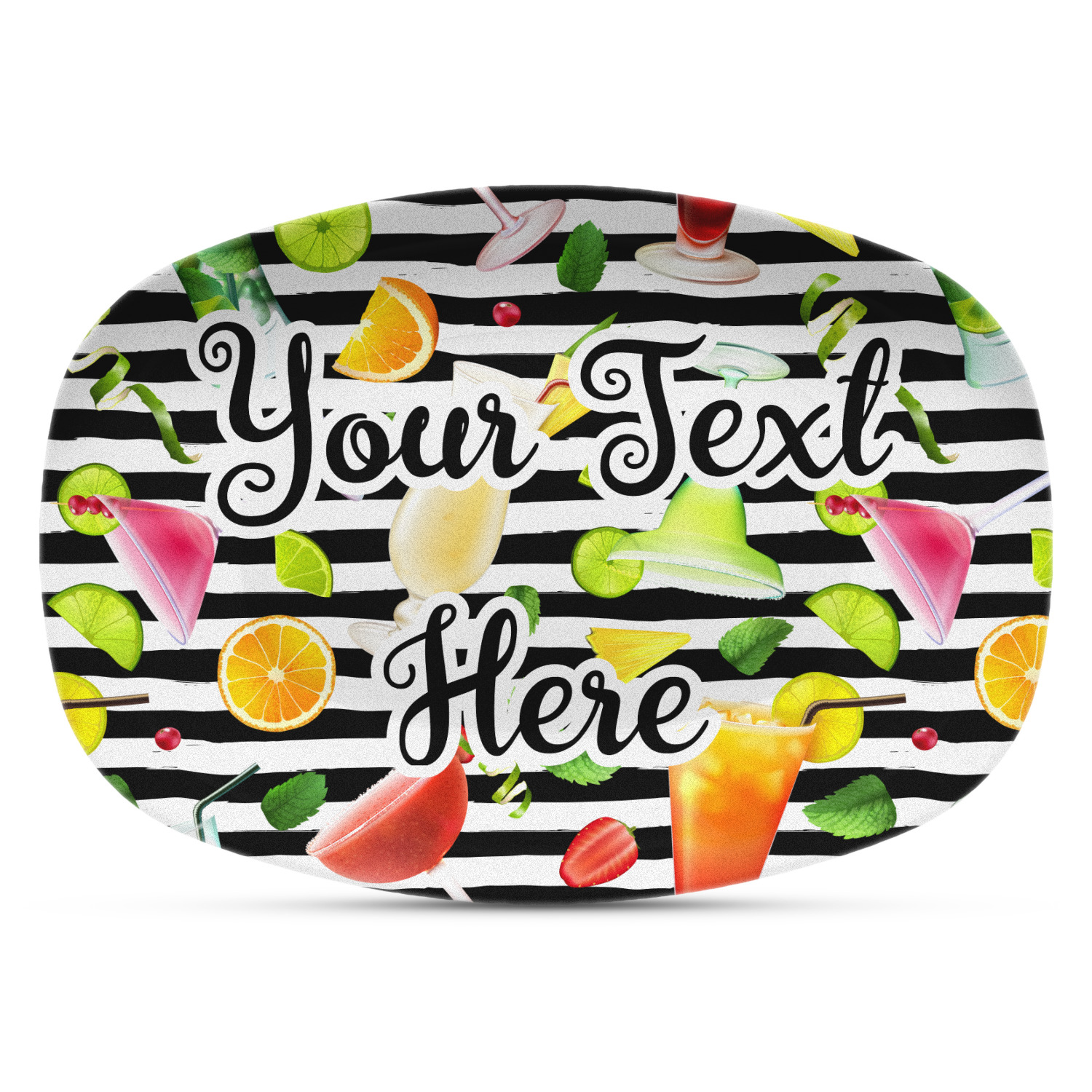 These serving platters are made from a composite, thermo-set, polymer plastic that gives it the versatility, durability, and weight of a melamine platter, without any of the downsides of melamine. These personalized platters, can withstand temperatures up to 250 degrees Fahrenheit, for up to 60 minutes. No harmful chemicals, such as BPA, formaldehyde, and DEHPs were used in the manufacturing of this product. This large serving platter measures at 14" x 10.25", and is spacious enough to hold any of your appetizers or bite-sized desserts. The platter exhibits your personalization across the entirety of its front.