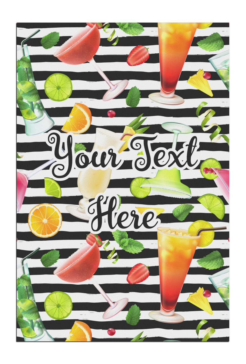 This design has gorgeous illustrations of several different kinds of mixed drinks from mojitos to margaritas. They're are a variety of colors like pink, orange, green, yellow, black, and white. Behind the cocktails is a fun striped pattern giving it a bit of pizazz. You are able to personalize the text with a name, monogram, or whatever you like.