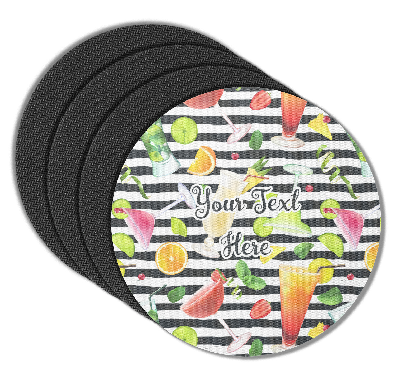 These drink coasters have a smooth, polyester top and a textured, rubber backing on its bottom. The non-slip rubber backing underneath works to keep any spills at bay. At 4 by 4 by 0.25 inches thick, these custom coasters are a suitable size for most drinkware. Your personalization is displayed atop the face of the cup coaster. We sell these rubber coasters in two different shapes: square and round. You can buy each shape as singulars or as a set of 4.