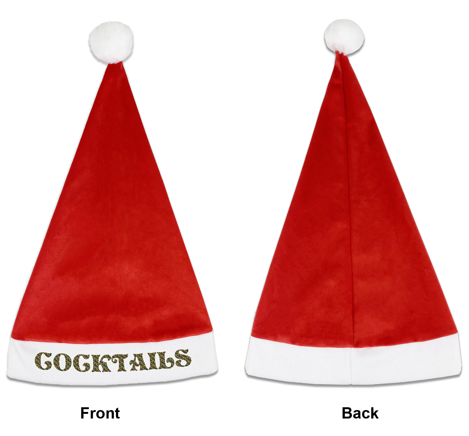 Our Santa hats are a soft, velvety polyester material. These customizable Santa hats are a classic red with white brimming and pom pom ball hanging off the hat tail just like Santa Claus! Each personalized Santa hat is approximately 17.5 L x 11.8 W. We offer two different styles to print your designs on the white brim - front or front & back.