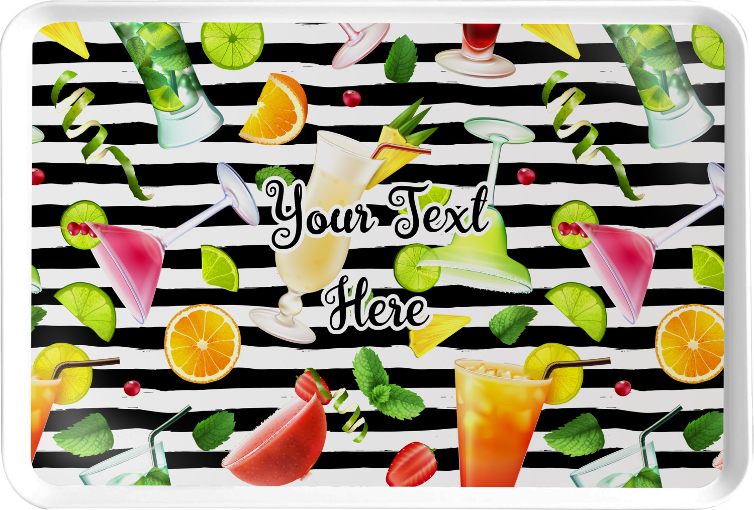 Made from a heavy melamine, these decorative trays are break resistant and are BPA free. At 14" x 9.25", these serving dishes are spacious enough to accommodate several drinks, bowls, or more. The tray features ridges underneath that allow for a sturdy stance upon any table or counter-top. We display your customization at the bottom of the tray's interior, while the remaining sides of the tray are a chic white.