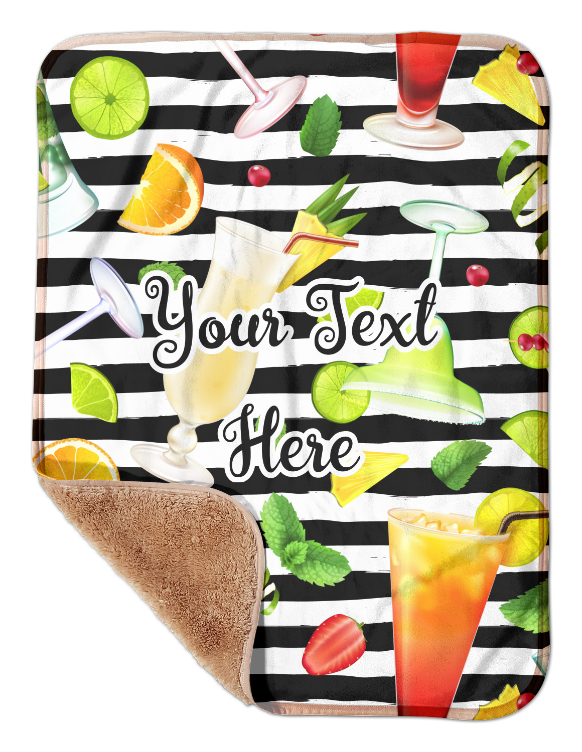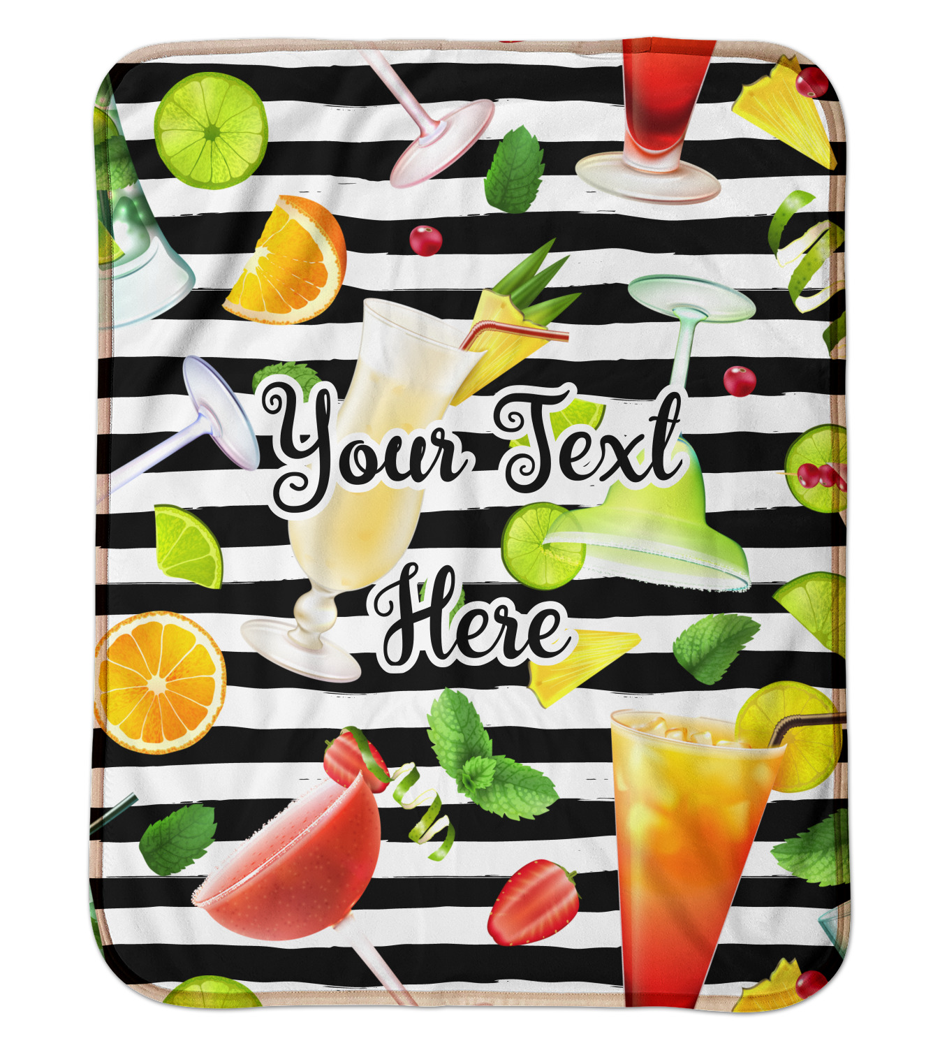 This design has gorgeous illustrations of several different kinds of mixed drinks from mojitos to margaritas. They're are a variety of colors like pink, orange, green, yellow, black, and white. Behind the cocktails is a fun striped pattern giving it a bit of pizazz. You are able to personalize the text with a name, monogram, or whatever you like.