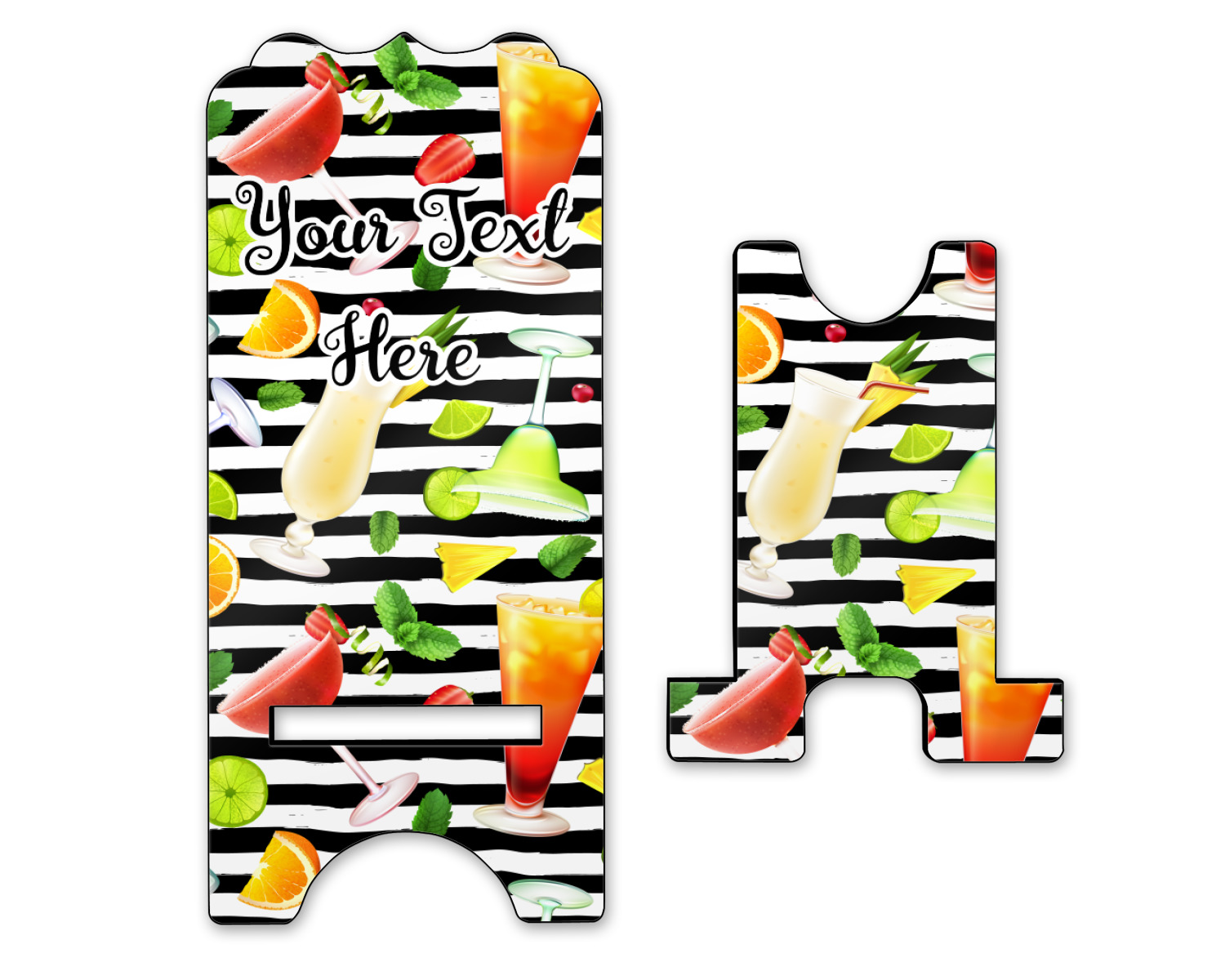 This design has gorgeous illustrations of several different kinds of mixed drinks from mojitos to margaritas. They're are a variety of colors like pink, orange, green, yellow, black, and white. Behind the cocktails is a fun striped pattern giving it a bit of pizazz. You are able to personalize the text with a name, monogram, or whatever you like.