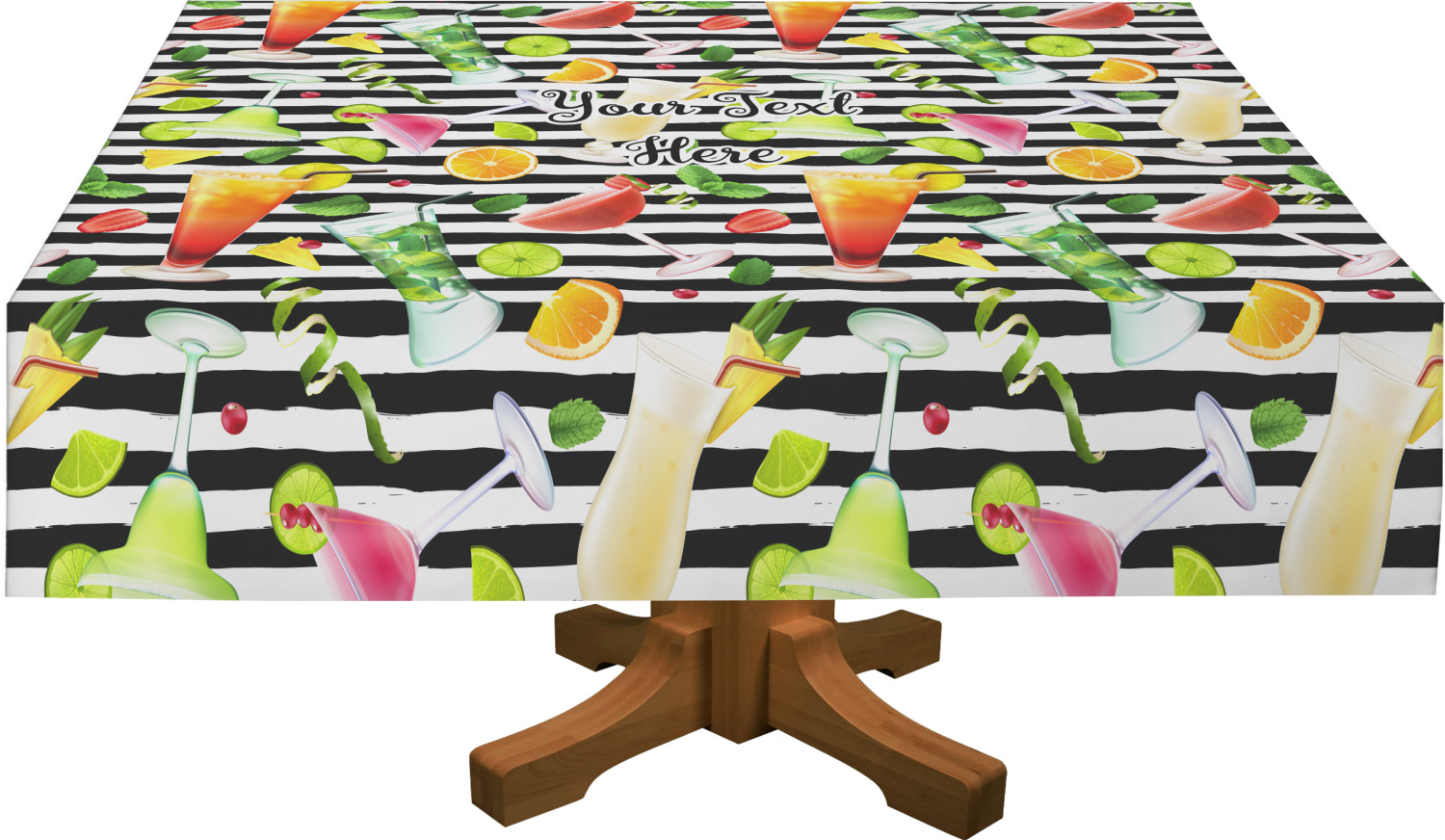 This design has gorgeous illustrations of several different kinds of mixed drinks from mojitos to margaritas. They're are a variety of colors like pink, orange, green, yellow, black, and white. Behind the cocktails is a fun striped pattern giving it a bit of pizazz. You are able to personalize the text with a name, monogram, or whatever you like.