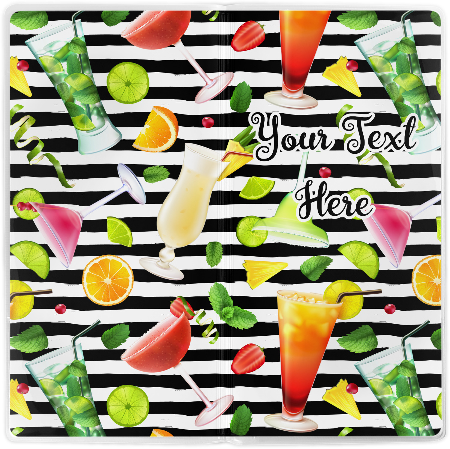 This design has gorgeous illustrations of several different kinds of mixed drinks from mojitos to margaritas. They're are a variety of colors like pink, orange, green, yellow, black, and white. Behind the cocktails is a fun striped pattern giving it a bit of pizazz. You are able to personalize the text with a name, monogram, or whatever you like.