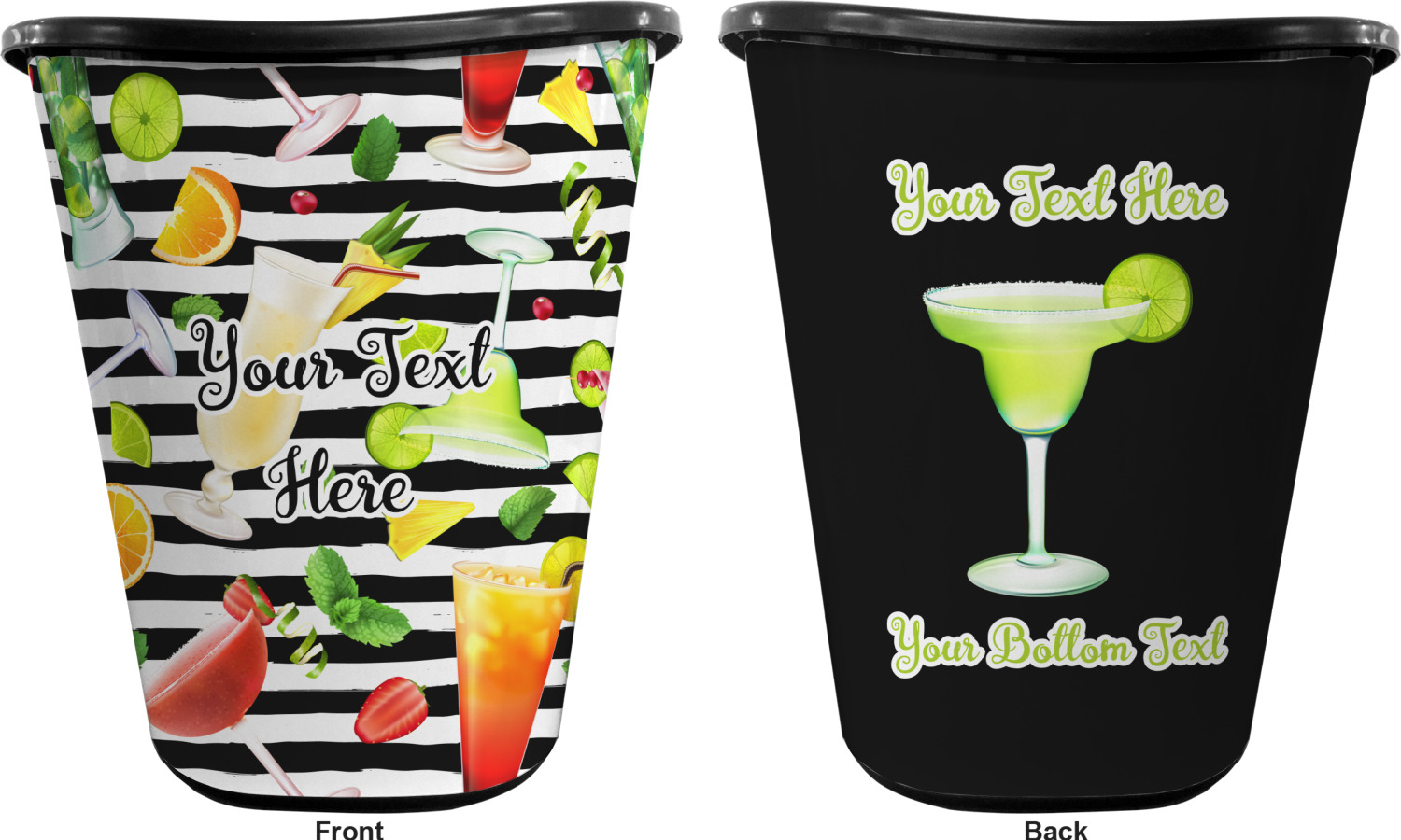 You can choose to purchase these decorative wastebaskets in either a white or a black color that will show on the base and the upper rim. Your customization is printed on a high-gloss, fine-quality vinyl adhesive, and you can choose to either have this adhesive applied to one side only or to both sides. As such, this plastic wastebasket can be single-sided or double-sided, depending on your creative vision. Your customization is printed using durable inks, making the design waterproof and resistant to fading over time.