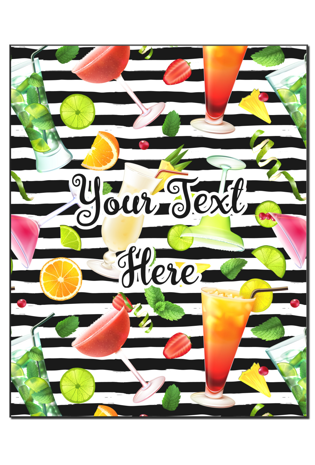 This design has gorgeous illustrations of several different kinds of mixed drinks from mojitos to margaritas. They're are a variety of colors like pink, orange, green, yellow, black, and white. Behind the cocktails is a fun striped pattern giving it a bit of pizazz. You are able to personalize the text with a name, monogram, or whatever you like.