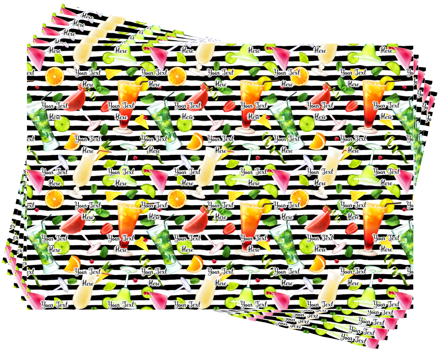 This design has gorgeous illustrations of several different kinds of mixed drinks from mojitos to margaritas. They're are a variety of colors like pink, orange, green, yellow, black, and white. Behind the cocktails is a fun striped pattern giving it a bit of pizazz. You are able to personalize the text with a name, monogram, or whatever you like.