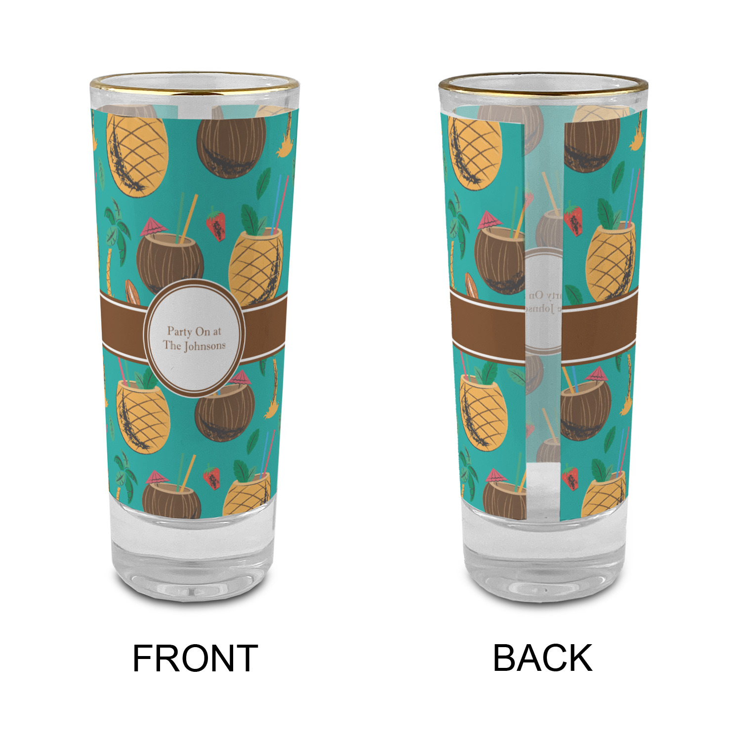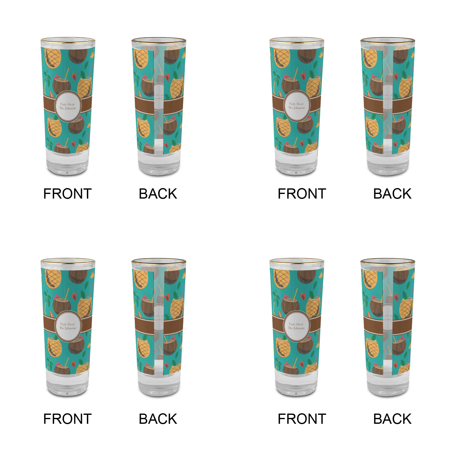 These glass shooter glasses are printed in full color with the design of your choice. These are a tall shooter 2 oz size and stand 4" tall. The print is a full wrap design to boldly display your personalization.