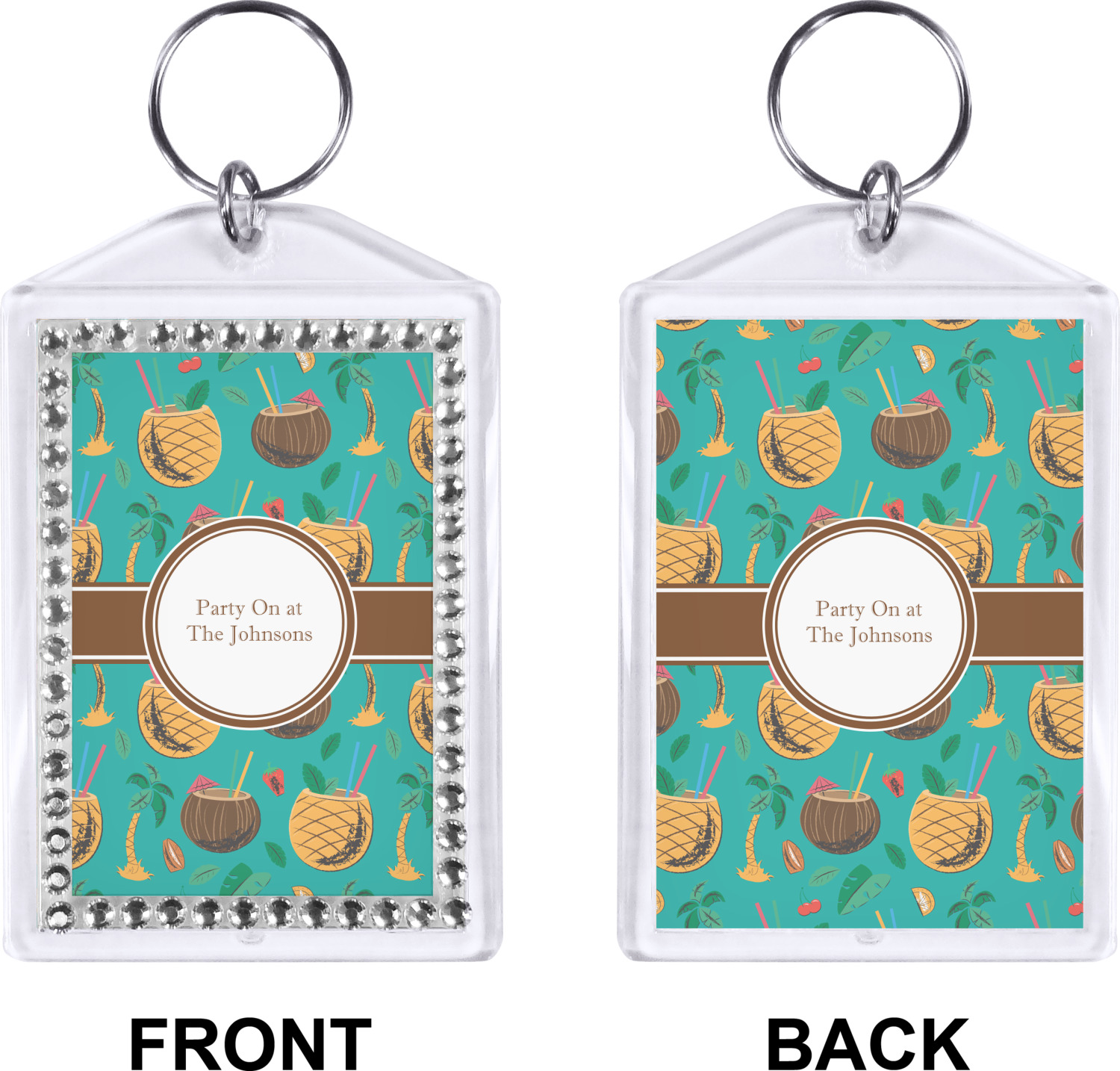 Our personalized keychains have a bold, rectangular shape, outlined by a series of shimmering rhinestones. A metal, split keyring is included with your purchase, and an additional metal hoop allows for attachment of the keychain to the split ring. This unique keychain measures at about 3.75 by 2.5 inches. We print your customized design(s) across both the back and front of this keychain.