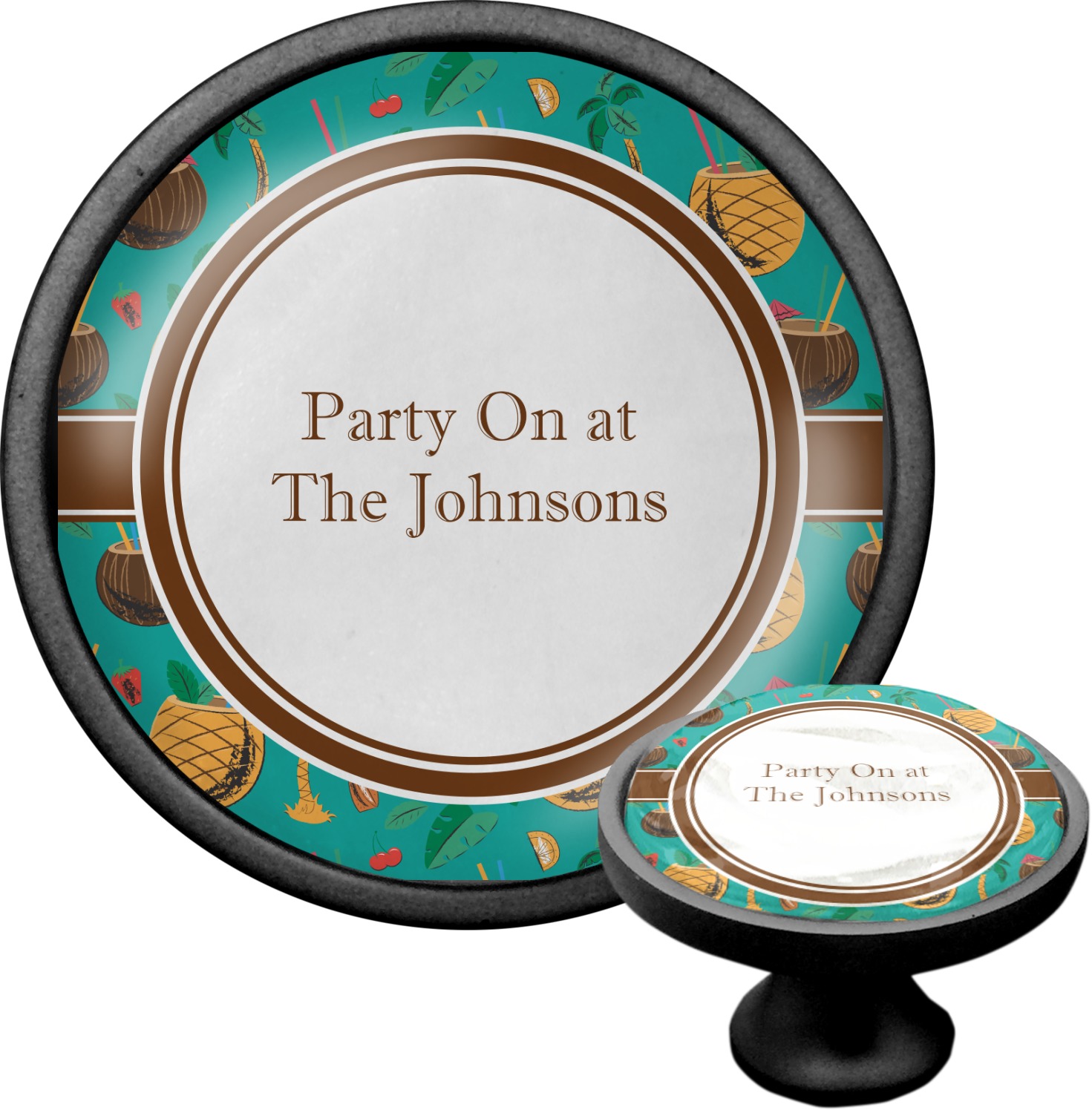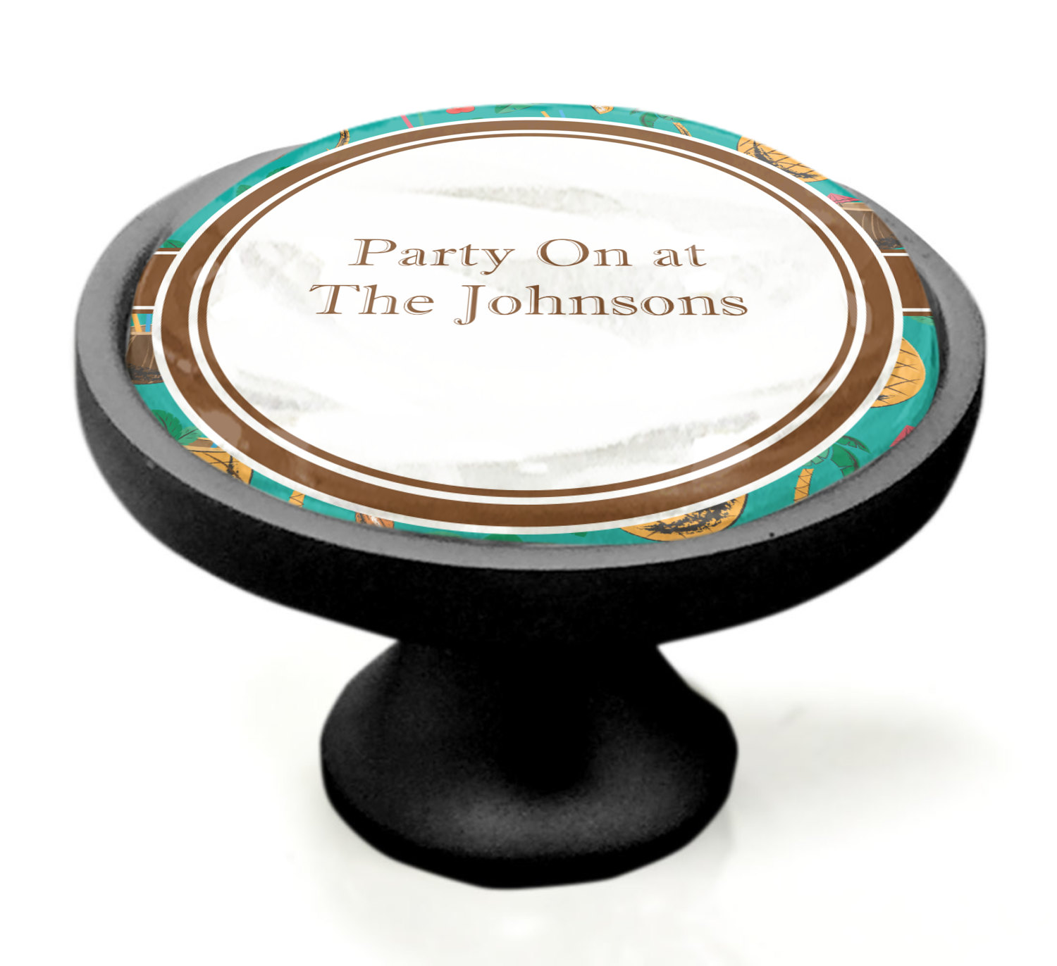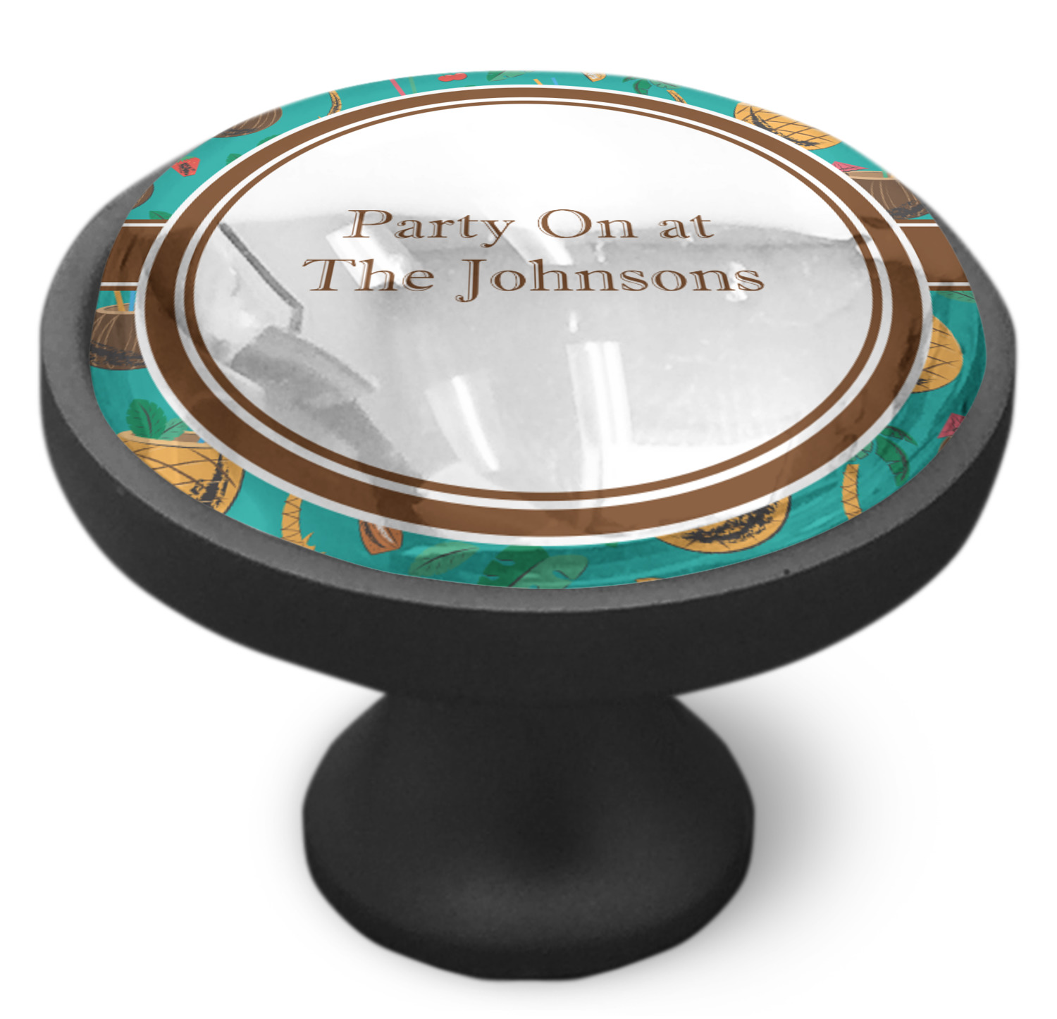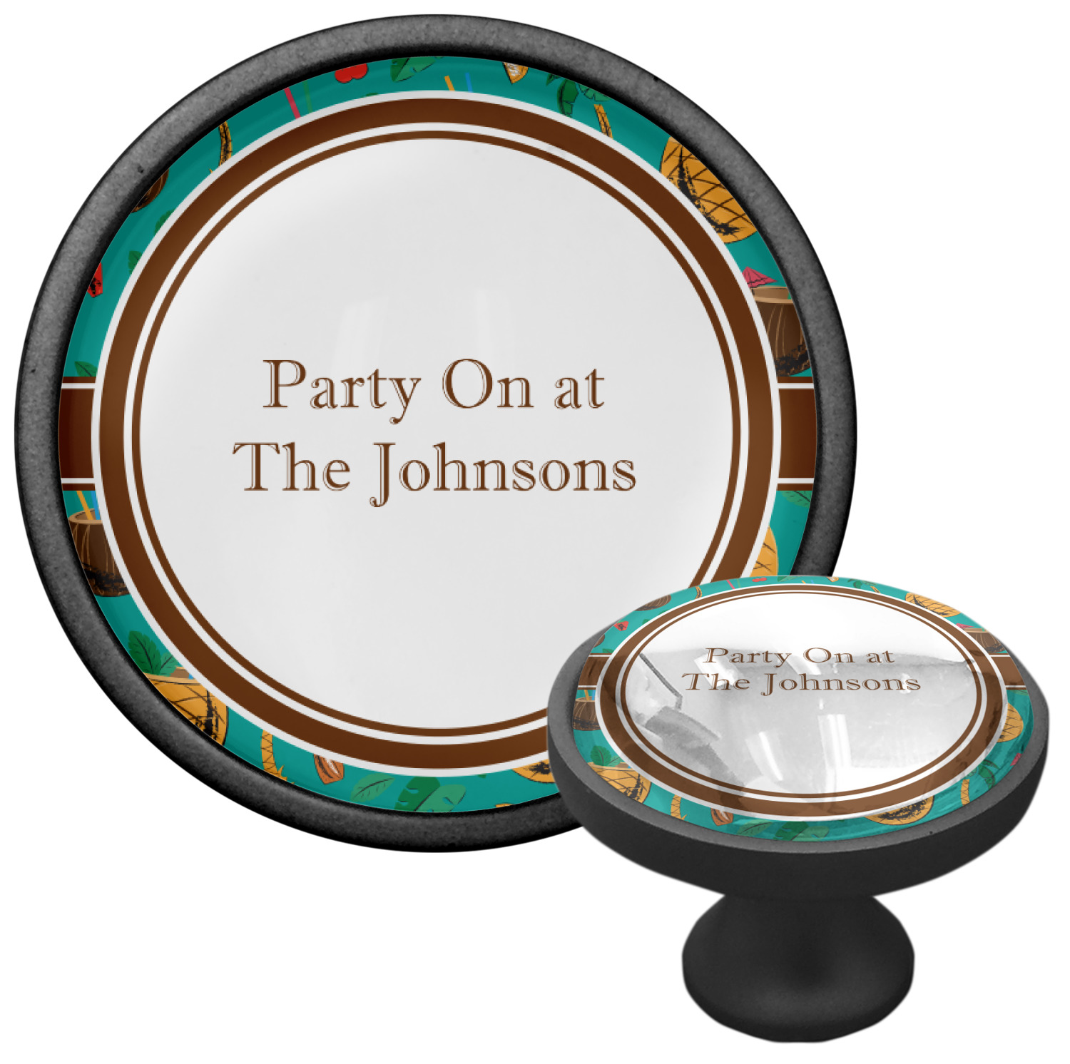 We sell these cabinet pulls in two different colors to better match your room's color scheme. We offer an oil-rubbed bronze base that is black in color, and a satin nickel option, which has a silver color. Your design is displayed across a high gloss vinyl insert that is placed on top of these cabinet handles. We then place a 1 inch thick glass cabochon atop the design, which seals the cabinet knob and makes the colors of your customization stand out. These custom cabinet knobs are approximately 1.3 inches in diameter. Your purchase includes a 1 inch screw that can be used to mount the knob to any cabinet in your home.
