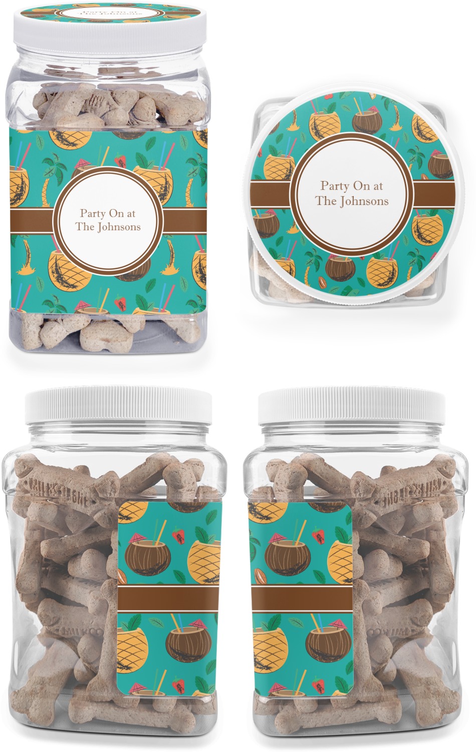 This half gallon jar, made from a sturdy plastic, is the perfect way to keep treats from any naughty pet paws, while still keeping them ready on hand for when your pup performs an impressive trick. This dog cookie jar features a screw-on, white lid that displays your personalized design on a vinyl sticker. We apply another customized sticker that wraps around the front and sides of the jar. Our dog treat jar also has indentations on the rear ends of the sides, which allows for convenient handling, and its square frame allows for easy storage.