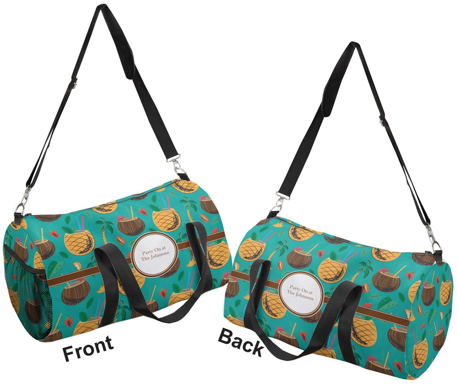 This duffle is a sturdy bag made of a canvas material. It comes in two sizes: Small (19"W x 9.5"H x 9.5"D) and Large (23"W x 12"H x 12"D). The bag is a cylindrical shape with a black adjustable strap and two handles. On one side is an elastic pouch to put a waterbottle or other small item. Your product will be sublimated with your design and is able to be designed on the front, back, and sides. Be sure to remember that the straps may cut into parts of your design if you upload your own artwork.