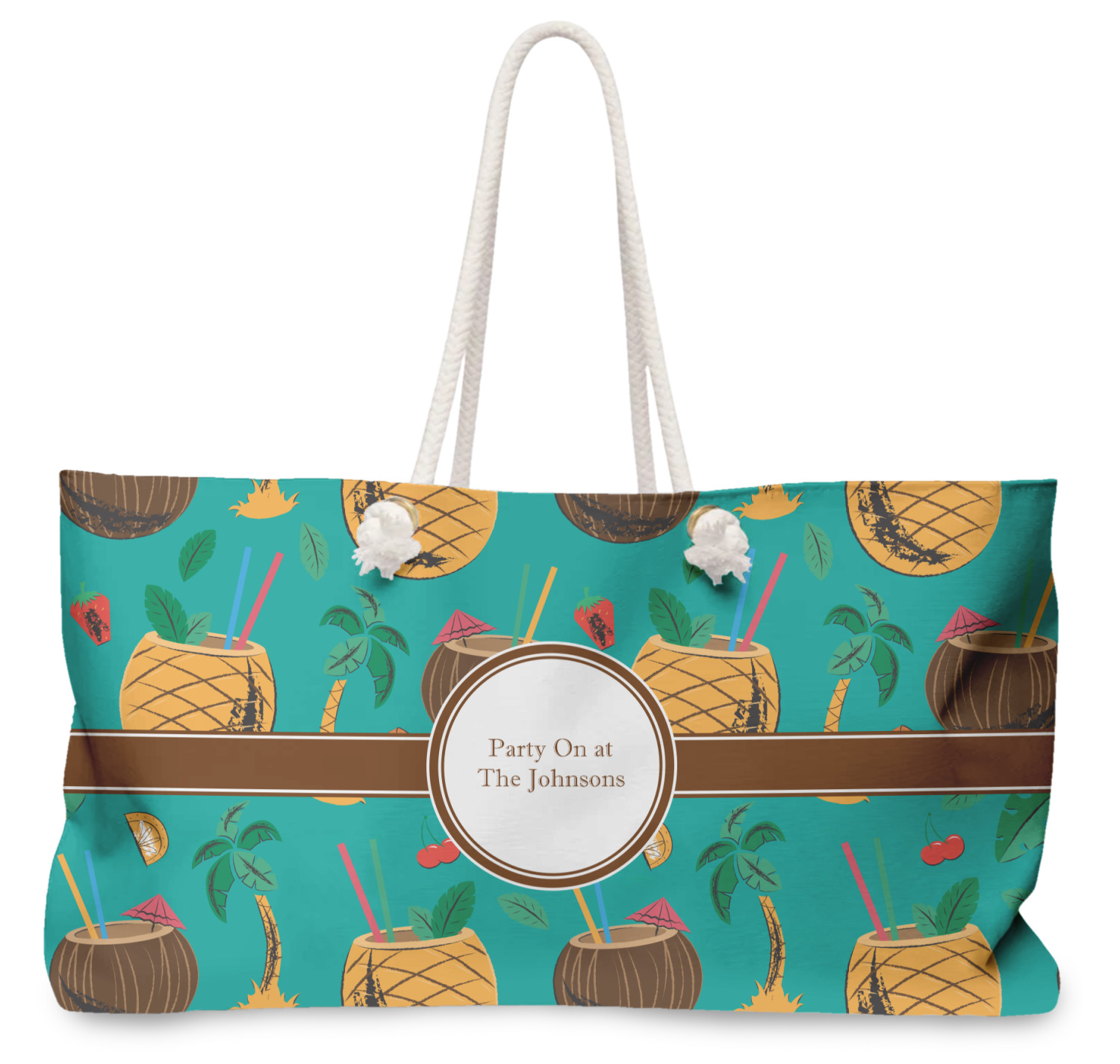 Our oversized weekender tote with rope handles is perfect for your weekend at the beach or on the town. This large tote are 24" W X 13" H, with a 5" gusset and a 27" thick rope handles with a knot that is put through a grommeted brass hole.