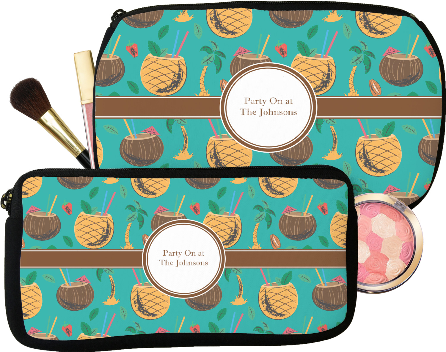 Our personalized makeup bags are available in many different designs, patterns and colors - so you are sure to find one that will love. They are made of neoprene (same material as wet-suits) and thus are water resistant, so spillages in your makeup bag will not end up all over you purse. They are customized on one side and are black on the other side and the zipper is black as well.