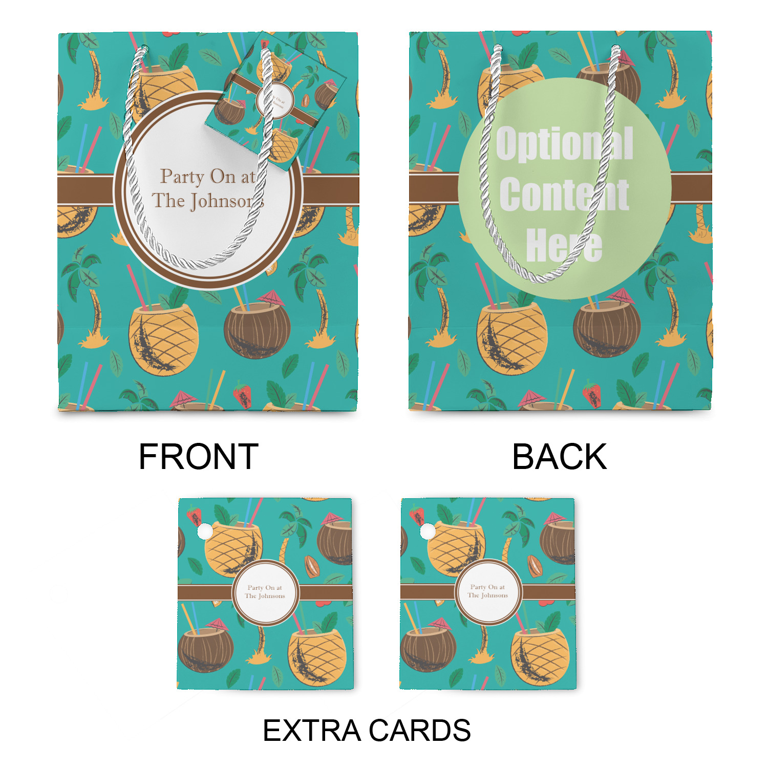 The bottom of the bag has a cardstock base to make the base more sturdy to hold up to all of your gifts. Each bag comes with one card on the rope handle and at least 1 extra card.