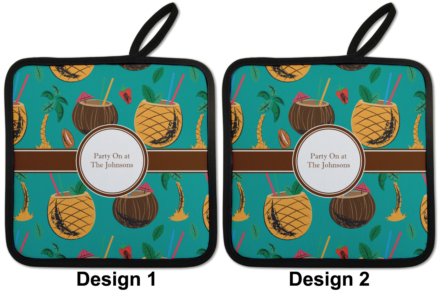 Our personalized pot holders feature a neoprene front that displays your personalization in vibrant colors. The backing of the hot pot holder is rubberized; the textured backing allows you to have a great grip when using this custom pot holder. The two materials are joined with a sleek, black trim, and the holder also includes an attached loop for hanging and storage. The pot holder is approximately 8.75 inches by 8.75 inches and 0.25 inches tall, while the fabric loop is 2.5 inches long. You can purchase a kitchen pot holder by itself or as a set of 2. We also offer a set including one pot holder and one oven mitt.