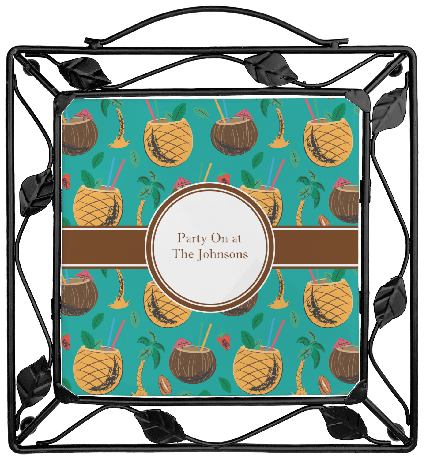 Our square trivets are made from a durable, wrought iron. This model features 4 small half circles, one on each corner, and a larger ring of iron that circles the central, customized tile. Each of the 4 corners has a round foot on its bottom for stability. This trivet is 8.75 by 8.75 inches, but the central tile measures at 6 inches on both sides.