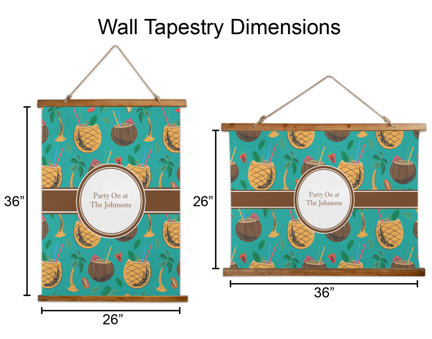 Made in two different orientations - portrait or landscape - both are 26" x 36". Your design is printed on a high quality polyester fabric with hemmed edges. The wood on the top and bottom of the tapestry is 1.25" tall and 0.25" thick and there are two pieces on top and bottom which sandwich the fabric.