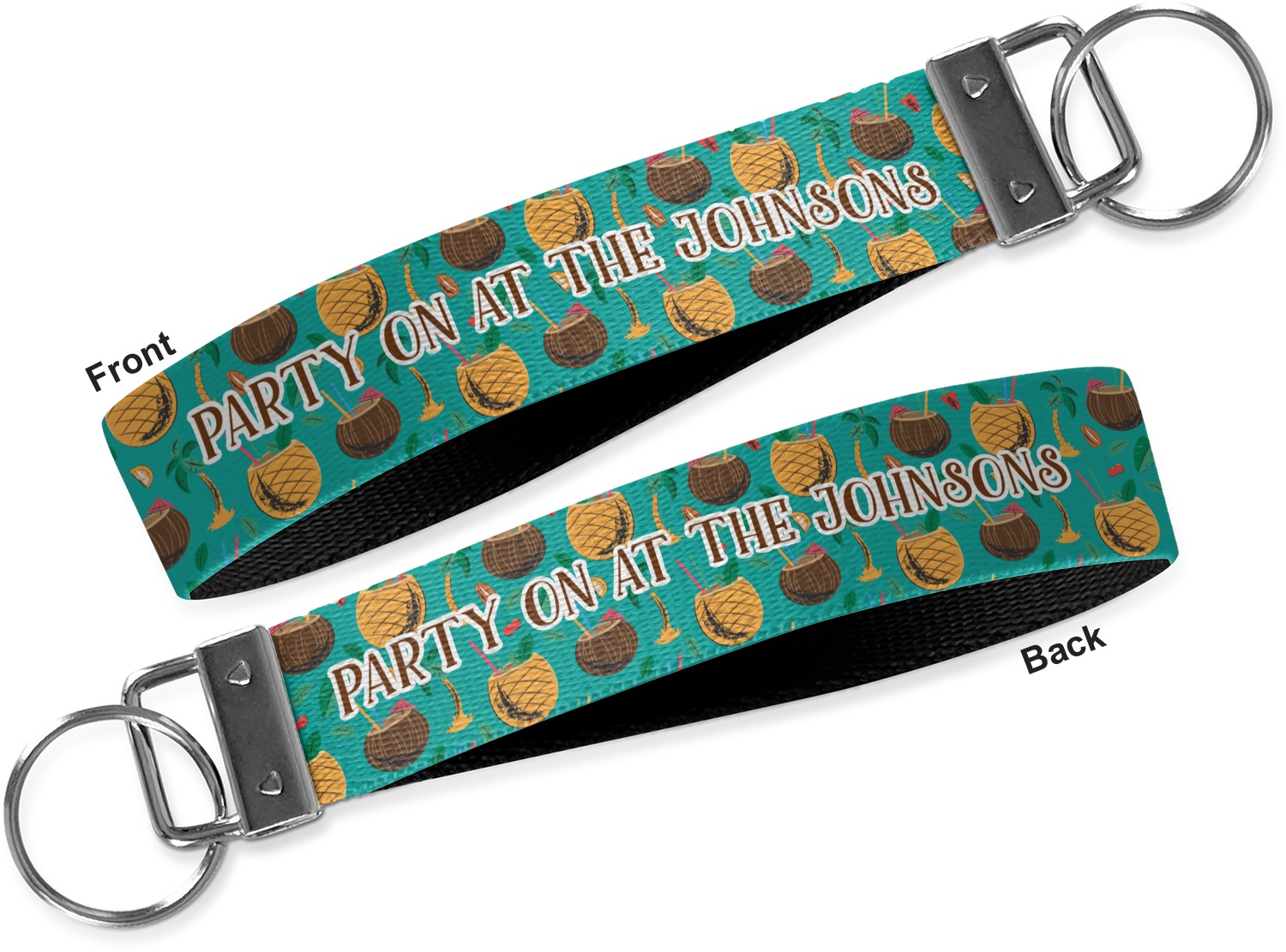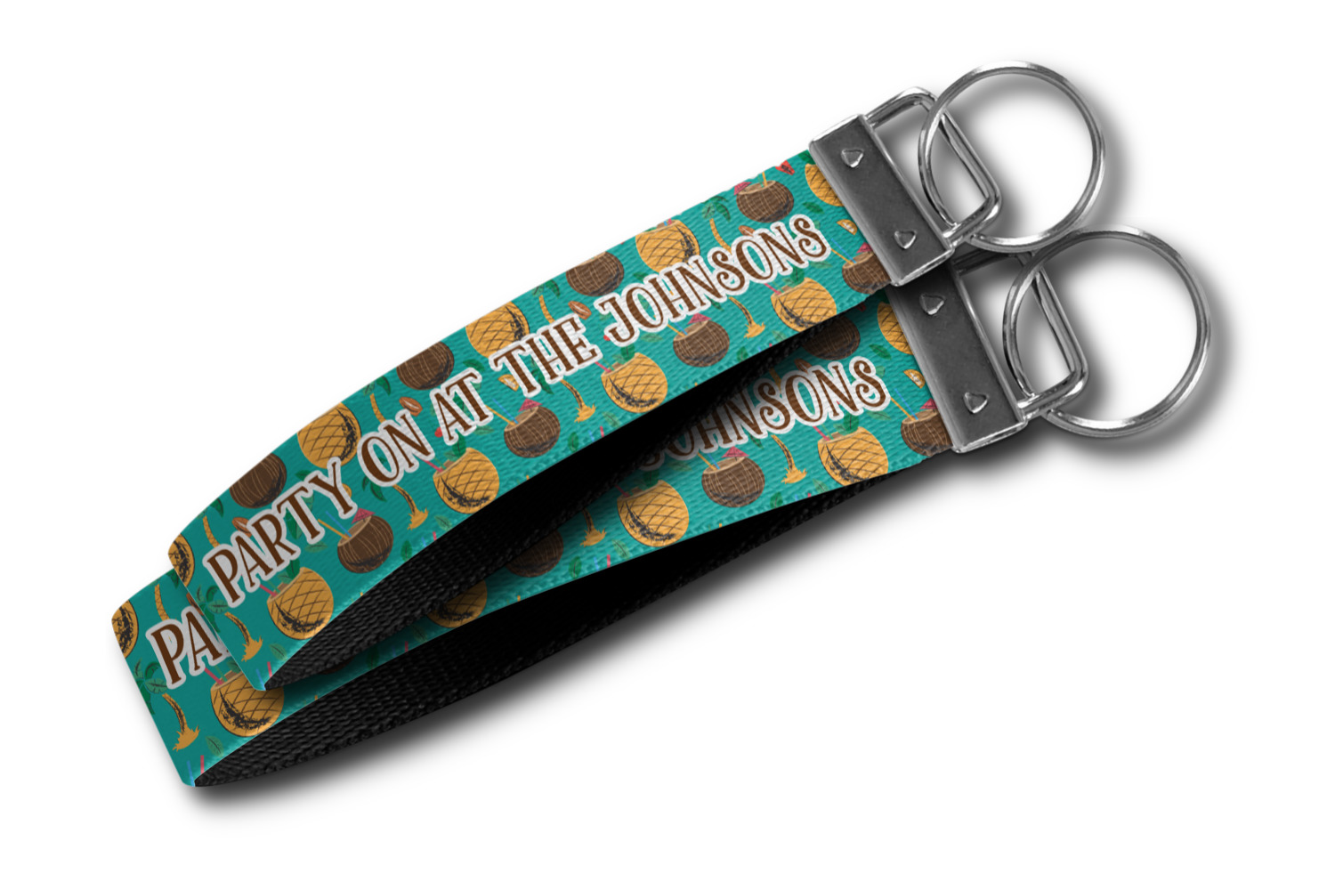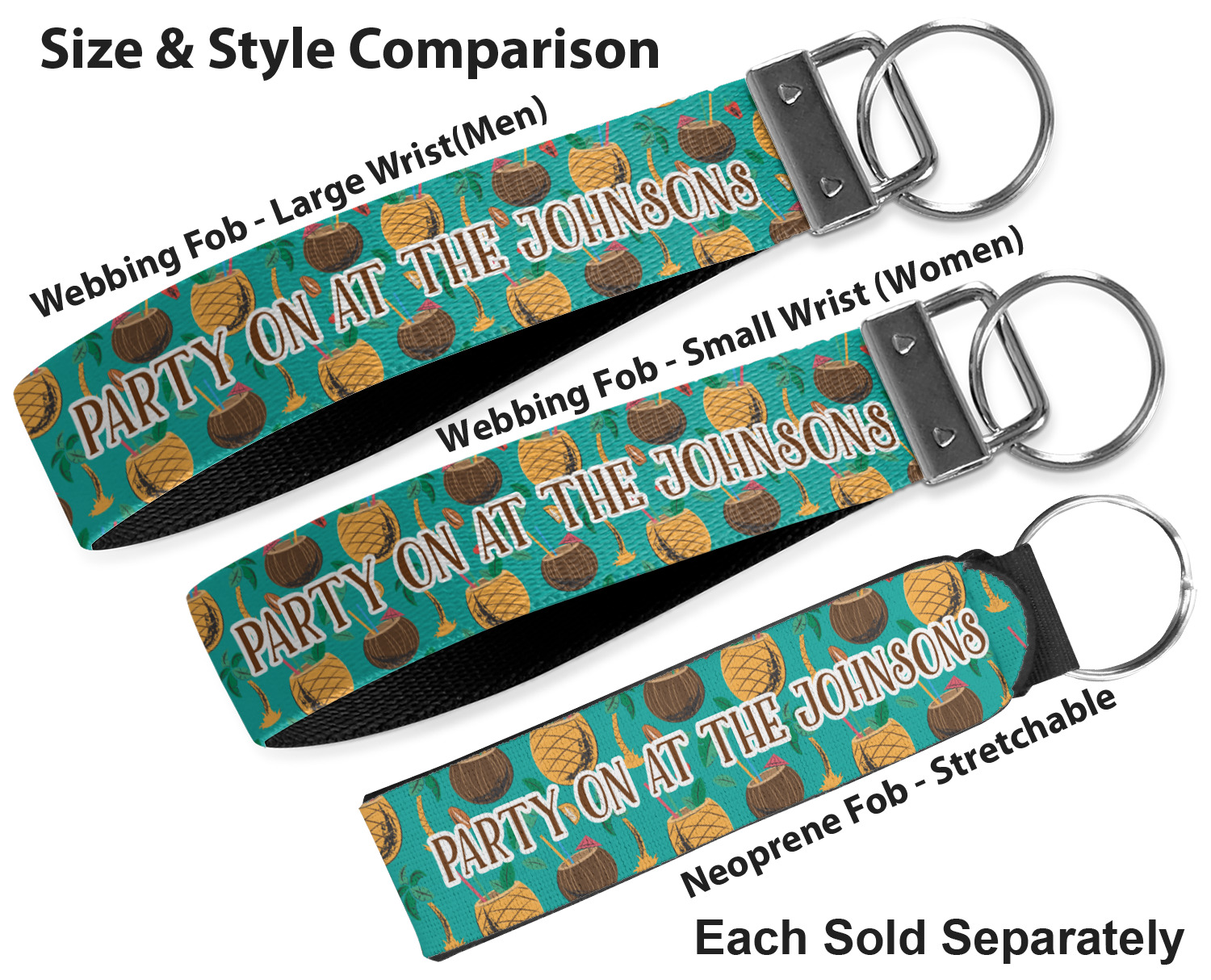 These key fob keychains are made from a polyester weave, right here in the USA. They feature a silver, metal clasp, attached to a round keyring. The piece gives the personalized wristlet a beautiful, finished look. Your customized design is printed on the outside of the keychain strap. We carry these wristlets in two sizes: small, which is 5 inches in width, and large, which is 5.5 inches in width.
