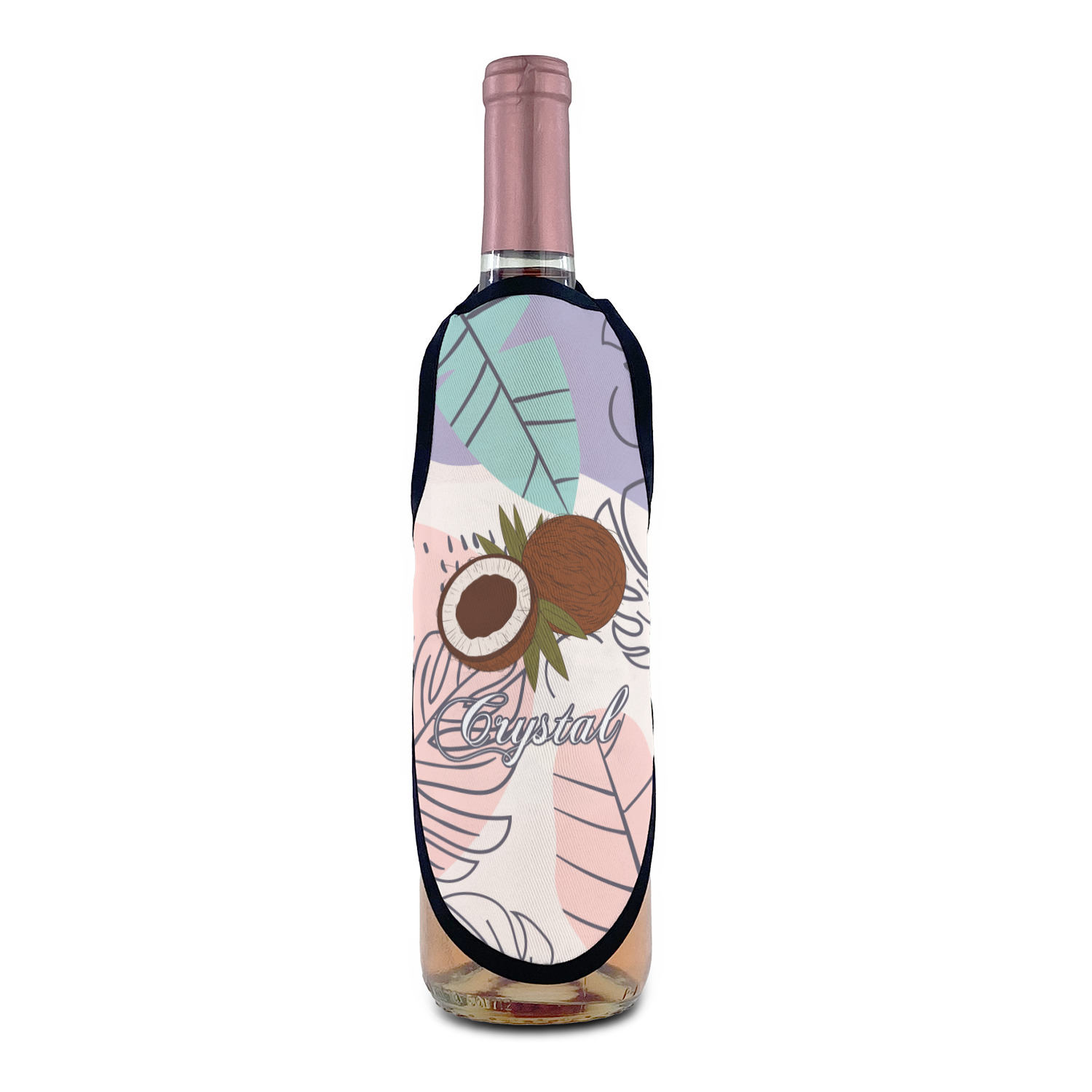 Made from a polyester fabric with black trim and tie string, these bottle aprons fit most large sized bottles including wine bottles, liquor bottles and dish soap bottles. With an included sliding cord lock the neck is adjustable to make these be a universal fit for most any sized bottle. The printed space of the apron measures approximately 8.5" tall and at its widest point the printed area is 6" wide.