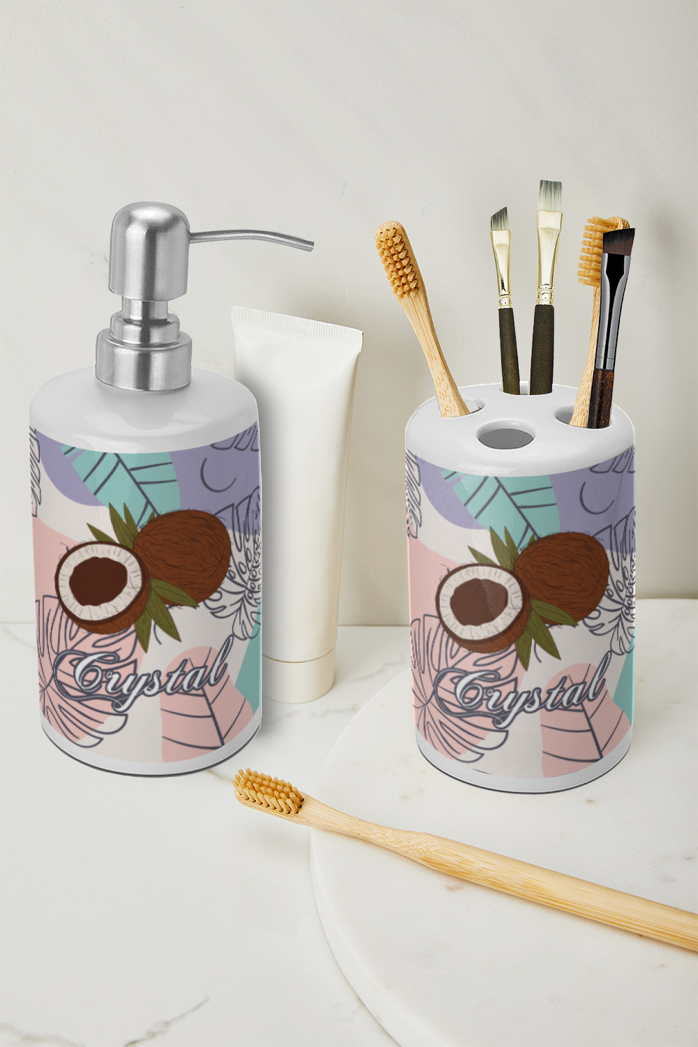 This two piece, ceramic bathroom set will add the perfect splash of color to any bathroom. This set includes one pump dispenser, ideal for soap or lotion, and one toothbrush holder with four holes. Although originally designed for toothbrushes, the holder will also hold make-up brushes, nail files, and other bathroom tools.