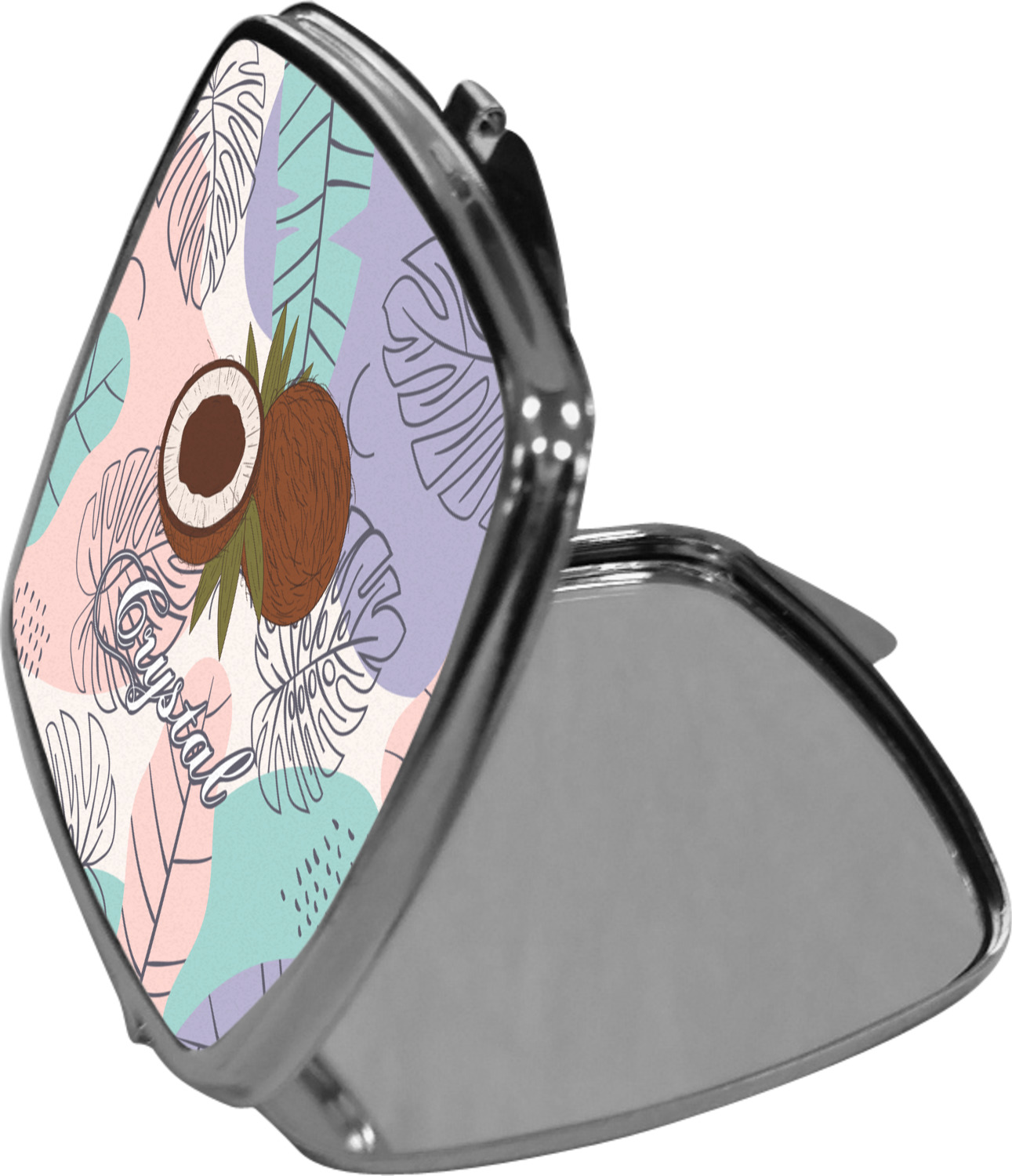 Our compact mirrors are customized with your design on one side. The other side is patterned silver tone metal. Inside, there are two mirrors.