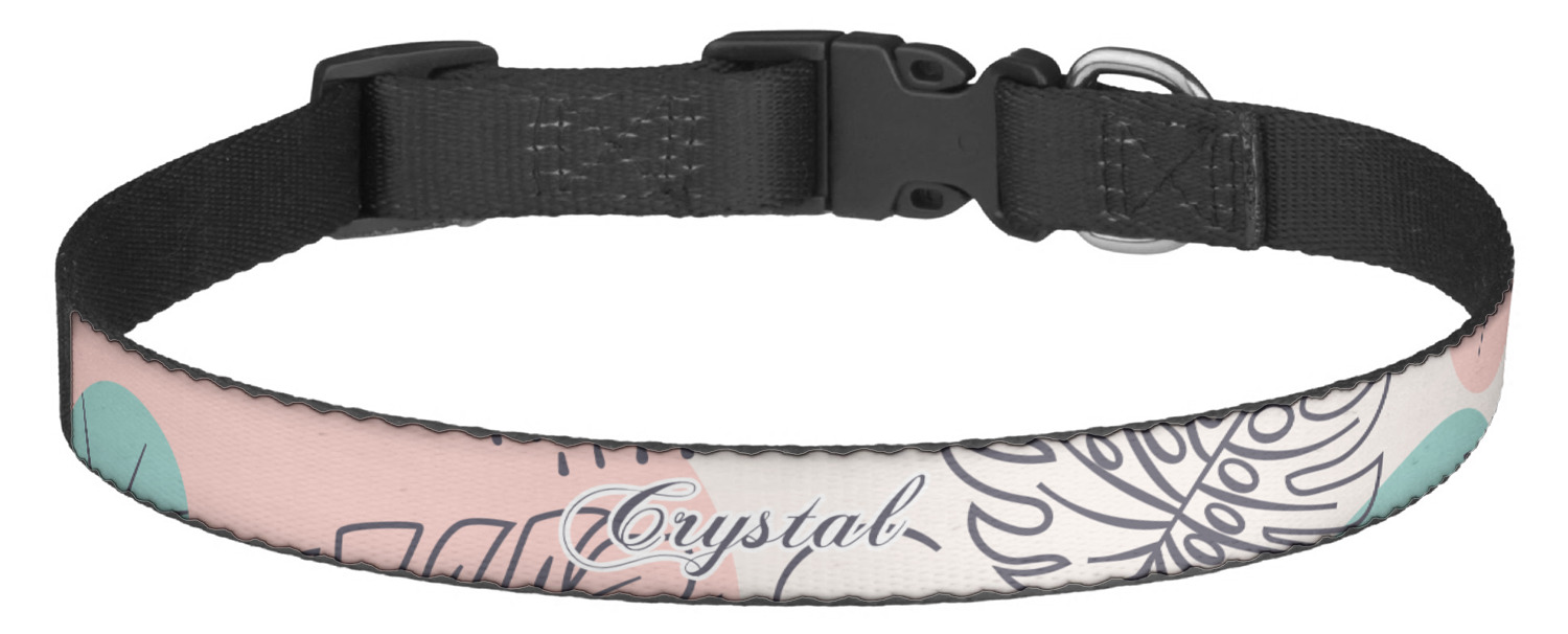 This sturdy collar, made from a durable nylon weave, will outlive your dog's episodes of excited tugging and pulling. Courtesy of its thick plastic buckle and adjuster, this collar is adjustable and accommodating of any dog. Structurally, the collar is a single piece of nylon weave that is sewn together, and features a solid metal loop where you can attach a leash or dog tag. We print and display your dog's name and pattern across the middle of the personalized dog collar.