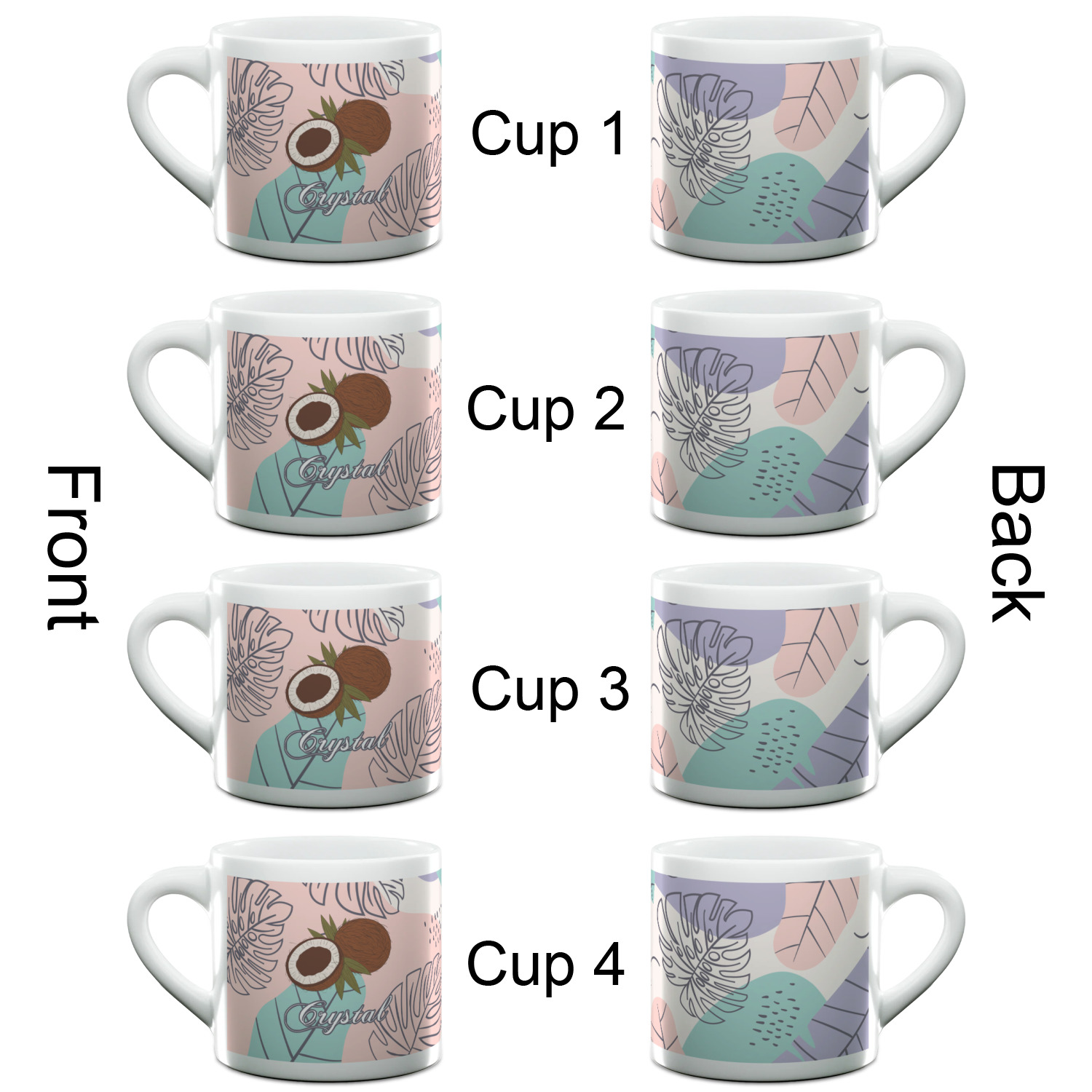 Each of our espresso mugs is a ceramic material sure to keep your drink warm. Personalize one cup for yourself, or order a set of 4! Its the perfect little gift for any coffee lover! We carry two sizes for you to personalize - 3 oz. (approx. 3.25" x 2.325" x 2.625") or 6 oz. (approx. 4" x 2.9" x 2.9"). Our 3 oz. mug is perfect for that single shot espresso while our 6 oz. mug can be your next favorite cappuccino cup holding two shots of espresso!