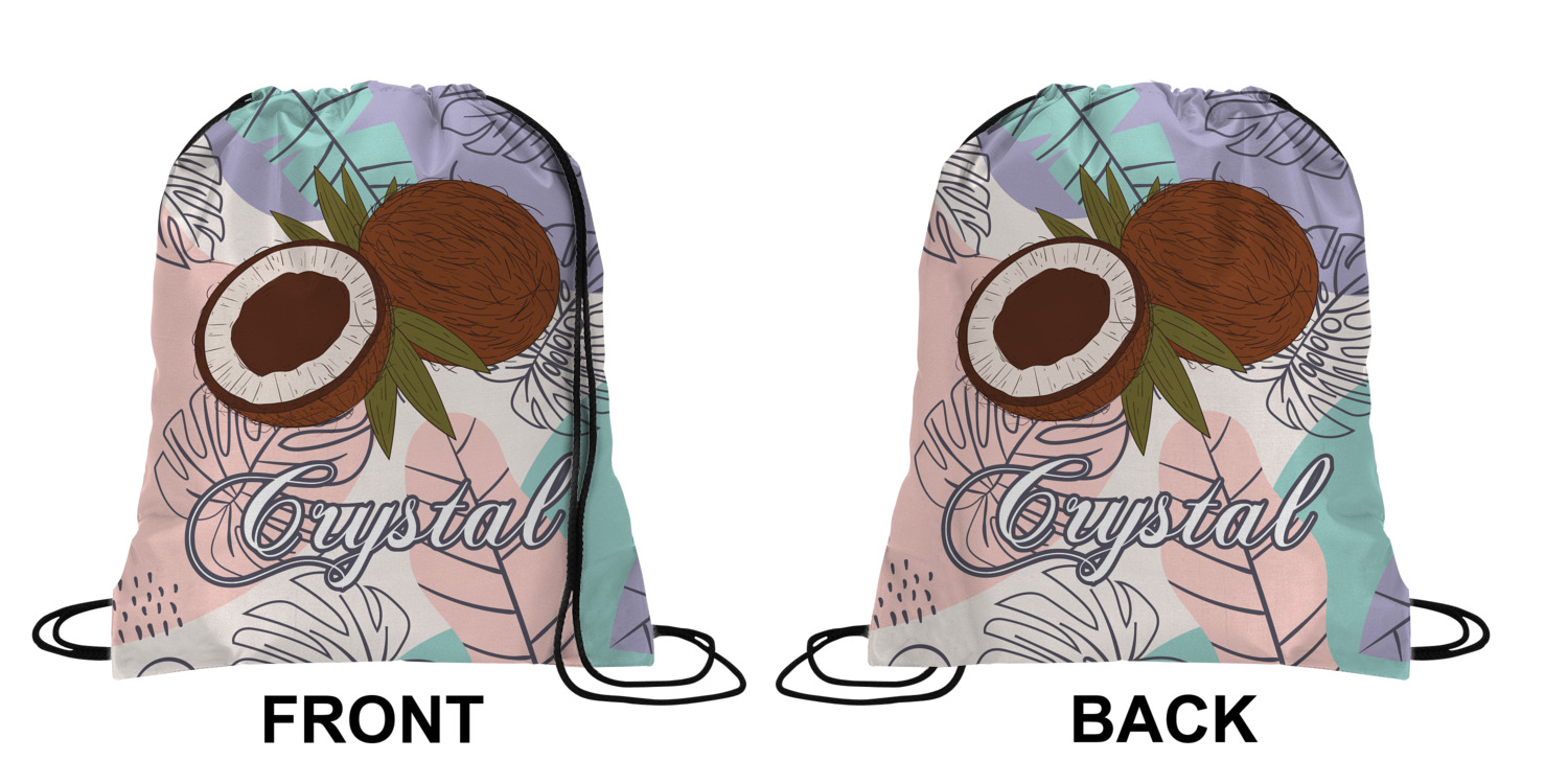 Your custom design will appear on the front and the back of the backpack. You can customize each side individually. The inside of the backpack is white and the drawstrings are black. The back pack is made of 100% polyester fabric.
