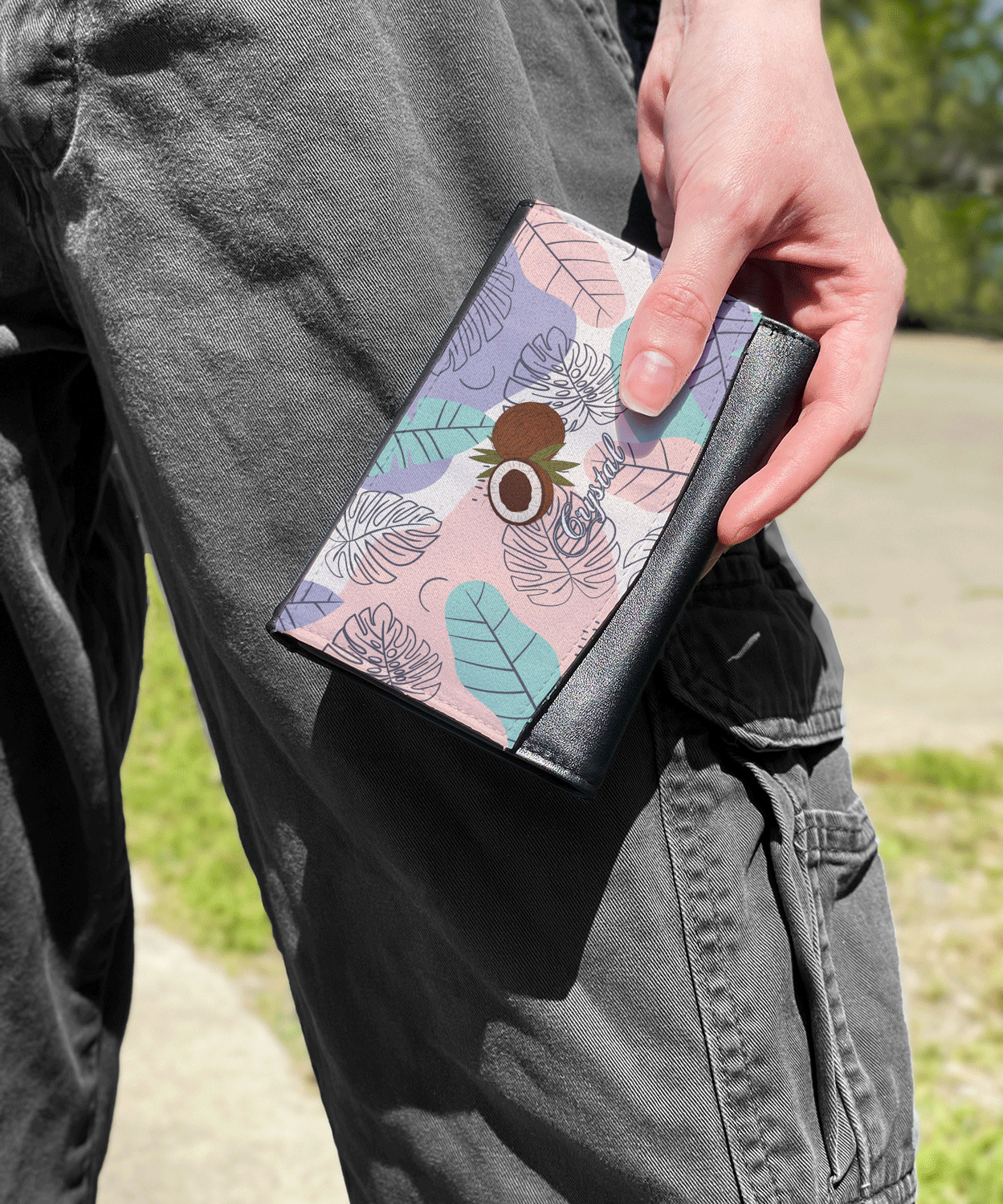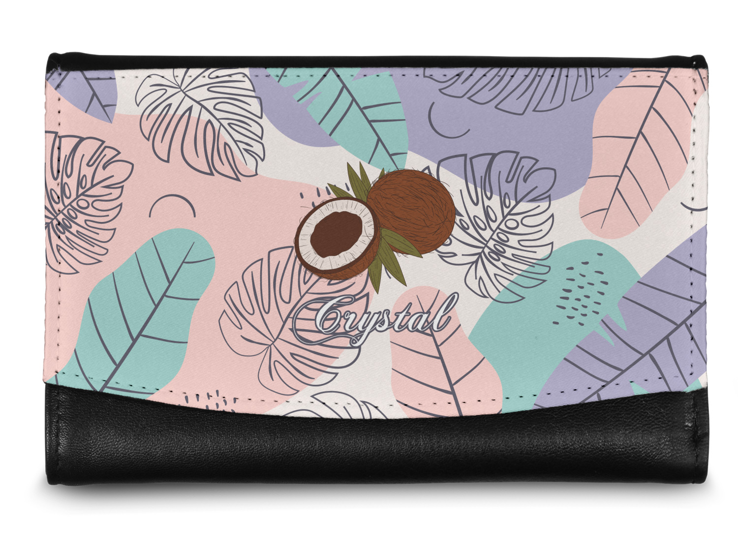 The compact size of this wallet - 5.5in wide, 3.5in tall and 0.75in thick when folded - makes it perfect to hold in hand and small enough to fit in a clutch or a normal size purse. The outside flap is customized with your choice of artwork and closes with a snap closure - with two different snaps to allow it to be adjusted when storing more items - to securely fasten the flap.