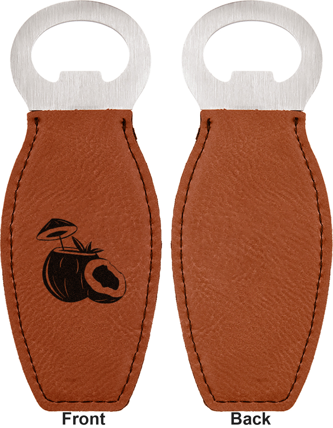 Built from stainless steel, these custom bottle openers are wrapped in a cognac-colored leatherette. Sharp, black stitching lines the edges for extra durability and a finished touch. Your personalization is laser-engraved onto the surface of this leatherette, leaving behind a crisp, black coloration. At 4.6 by 1.8 inches, this beer bottle opener gives you much of leverage when trying to open a stubborn bottle. On the opposite end of the opener, you'll find a magnet that you can use to display your new, unique bottle opener!