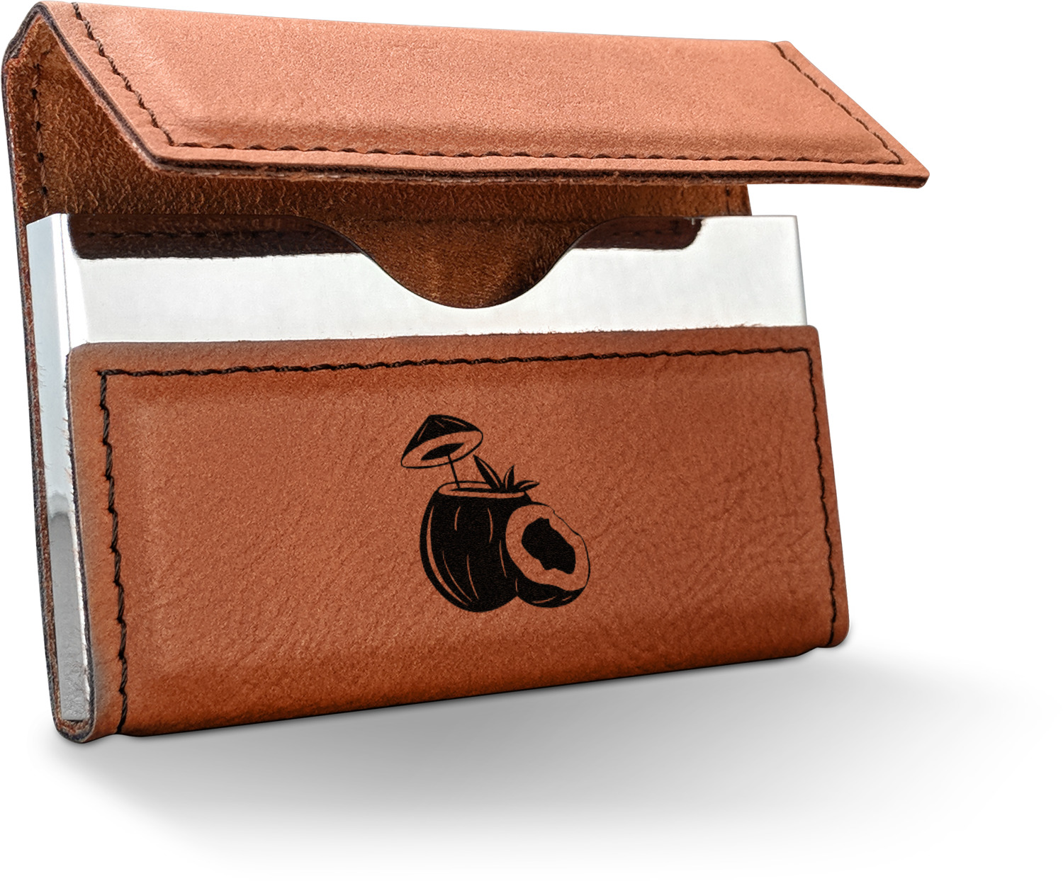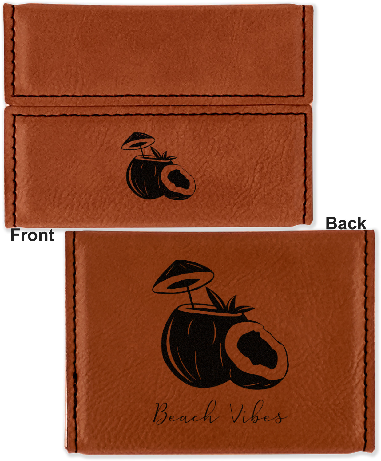 Your personalized design is laser engraved onto either the front, or the front and back of the card holder, depending on the model you purchase. Once engraved, the design will appear a darkened black against the cognac color of the leatherette.