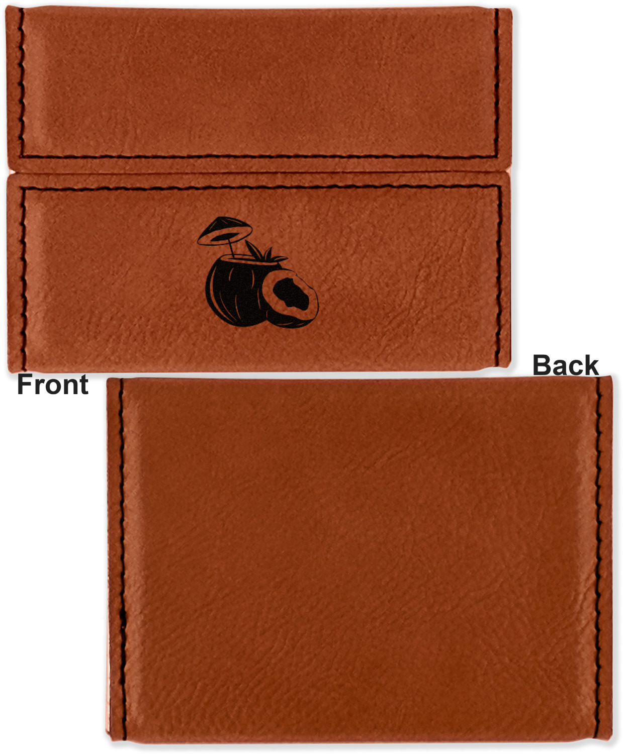 Your personalized design is laser engraved onto either the front, or the front and back of the card holder, depending on the model you purchase. Once engraved, the design will appear a darkened black against the cognac color of the leatherette.