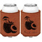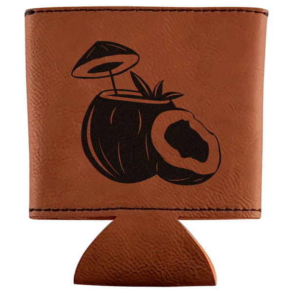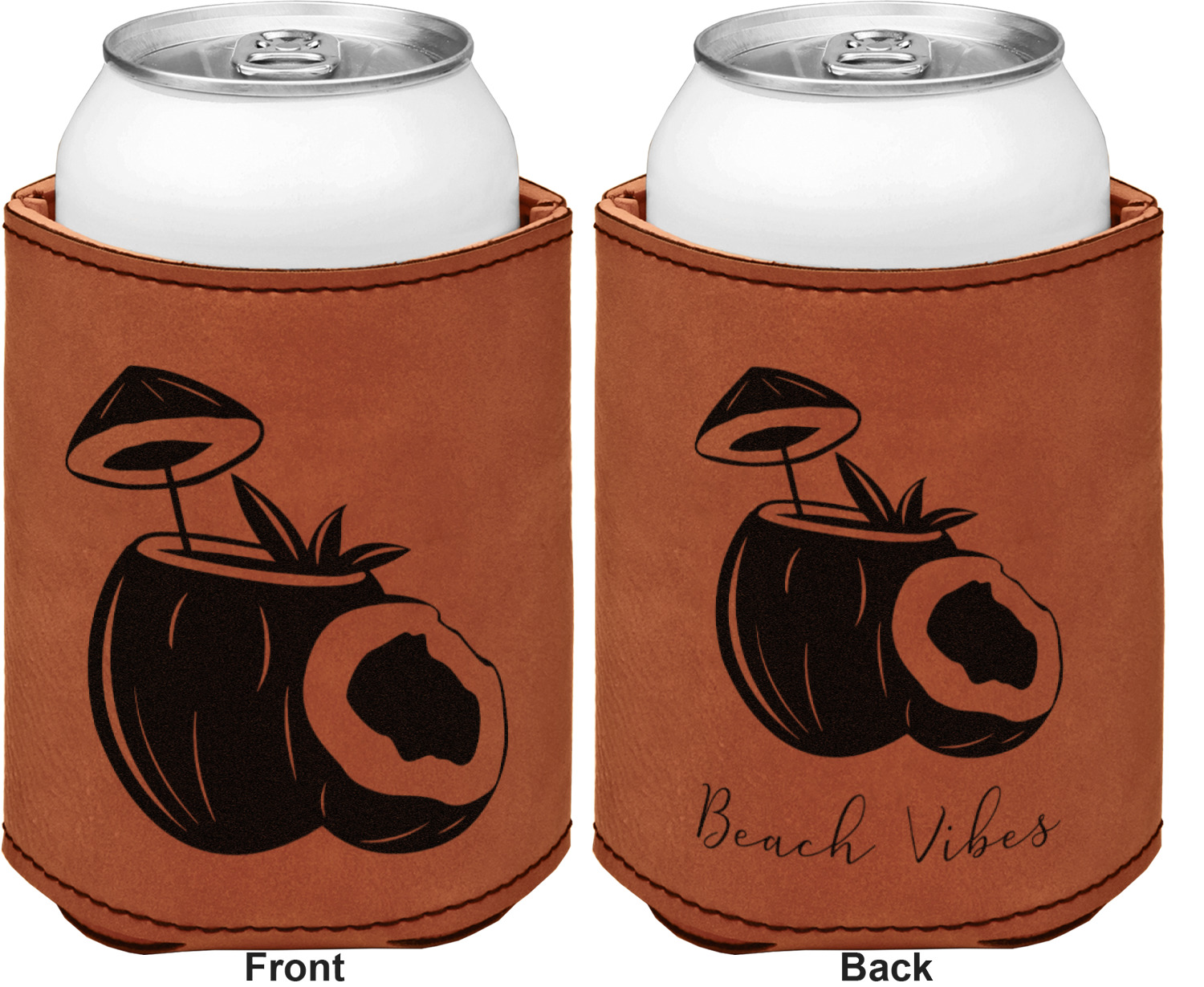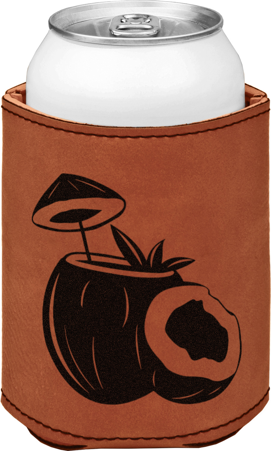 This can sleeve is made from a cognac-brown leatherette and stitched with a sturdy, black thread. A slim padding lines the inside of your can sleeve to allow for a better fit once your drink is inserted. The sleeve itself measures at 4 by 4.5 inches, allowing this custom can sleeve to accommodate most canned drinks. Your personalized design can be engraved on the front and back, or solely the front. When laser-engraved, your design appears as a black coloration which contrasts the leatherette nicely.