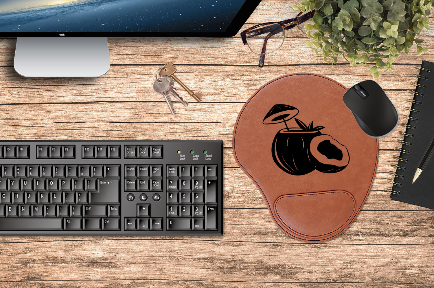 In a rounded shape, this mouse pad is made of a luxurious, cognac-colored leatherette. The nature of this material allows your mouse to glide smoothly across its surface. Strong stitching lines the edges to guarantee stability and strength. As added support for tired wrists, your personalized mouse pad features a supportive wrist rest at its bottom. This model measures at 10.25" x 9", while its wrist pad is approximately 5" x 2.75", with a thickness of 0.75". Your personalized design is laser engraved into the front face of this mouse pad.