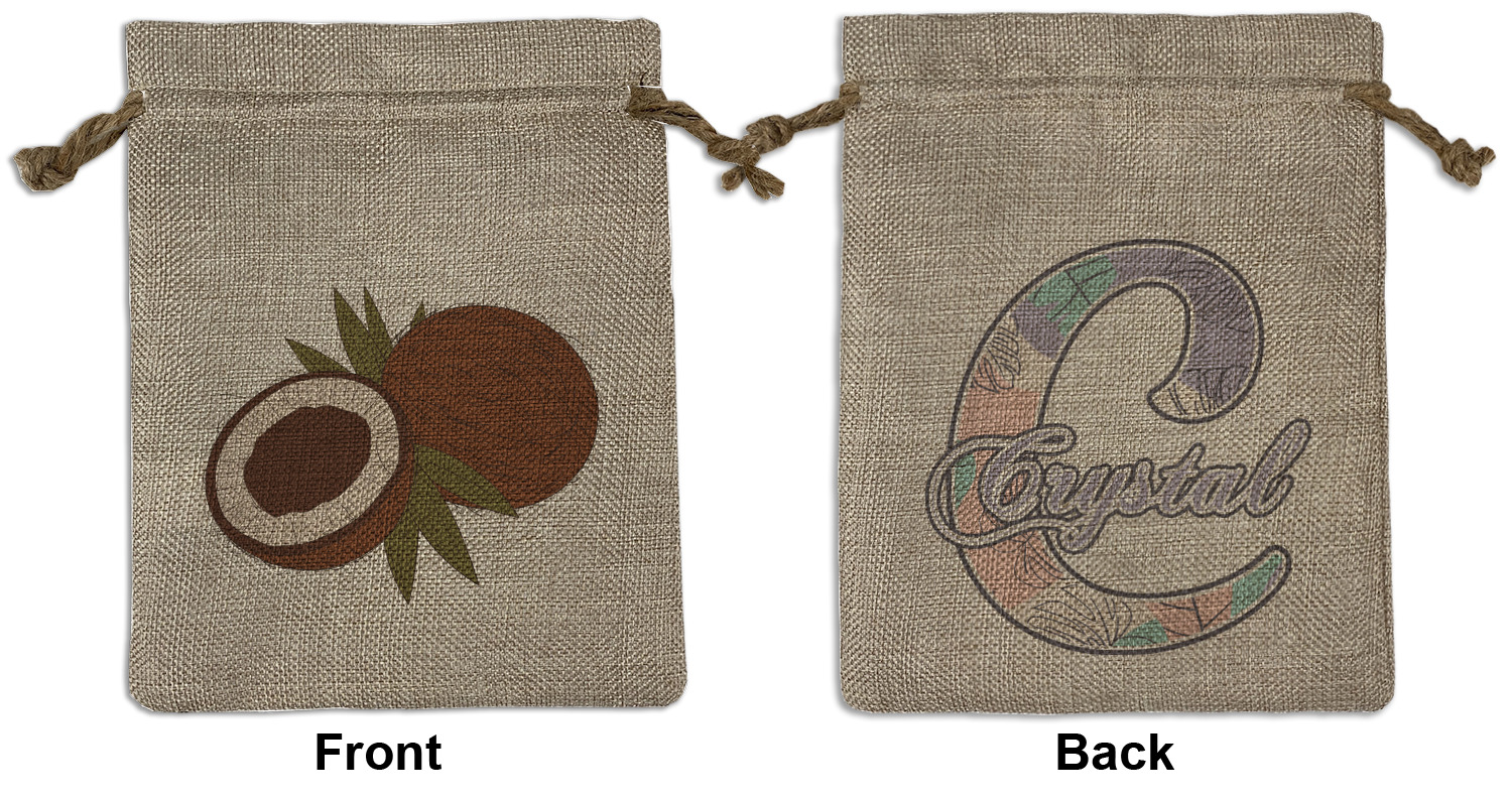 We sell our Burlap Gift Bags in 3 variant sized bags. Made with burlap polyester, each personalized bag can be secured with a twine drawstring pull. Your custom design is available to print on one side or both sides - completely up to you! The sizes of the bags measure approximately 4.5" x 6.5" for the smallest size, 6.5" x 8.0" for the medium size, and 6.5" x 13.5" for the large-sized bag.