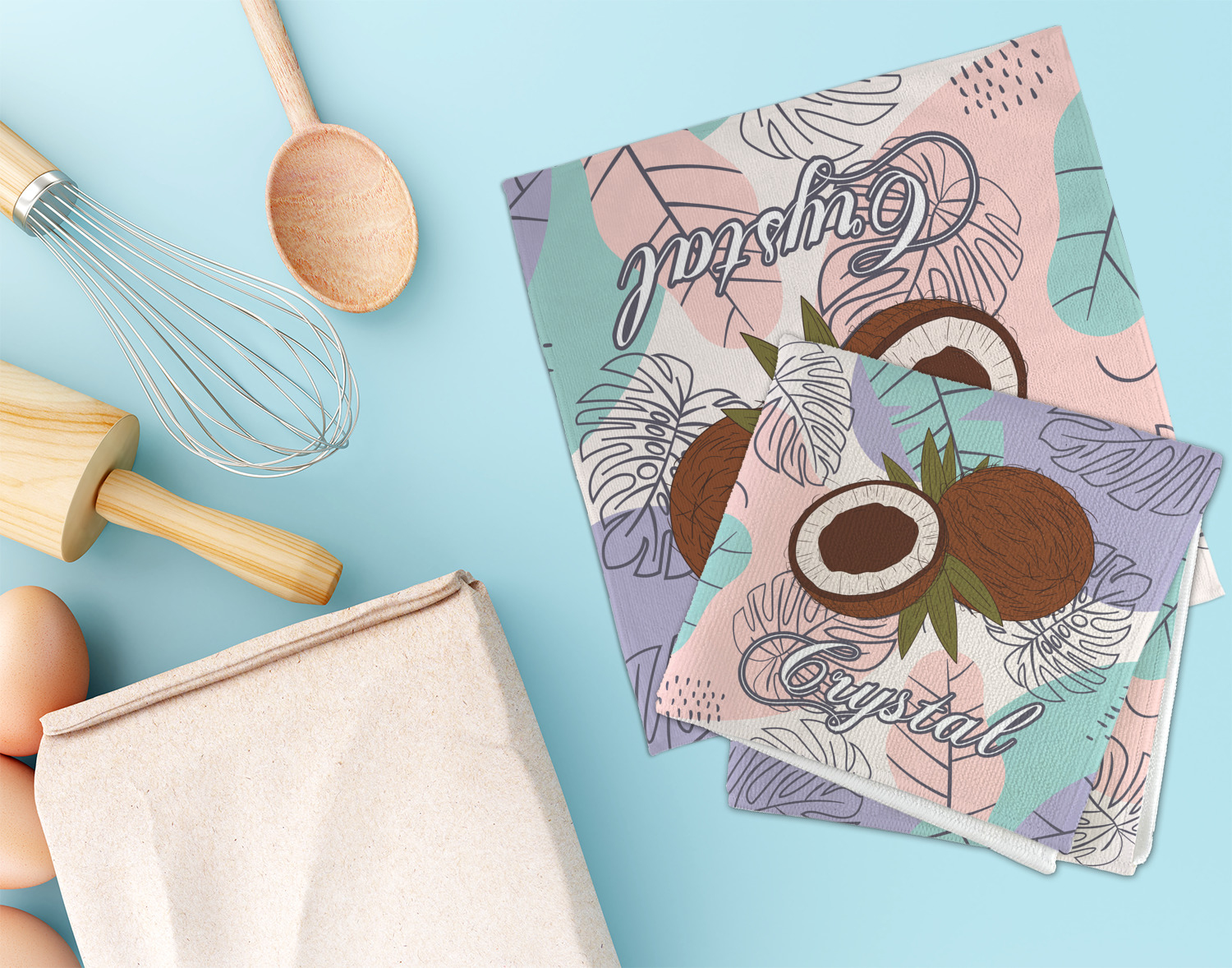 Coconut and leaves are sure to remind you of refreshing summer memories! Splashes of color bring life to the tropical leaves that surround the fresh coconut placed in the center. This custom design is perfect for customizing towels, apparel and other home decor!