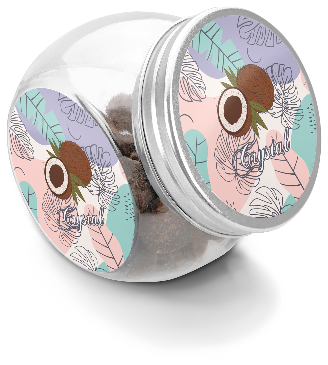 This treat jar is an excellent way to store treats for your favorite canine or feline. Moreover, their delicate, classy appearance makes them a tasteful addition to your countertop's décor. Crafted from clear glass, its unique construction and silver metal, screw-on lid allows for quick and easy access. Three, permanent, vinyl stickers are applied to both sides of the jar and lid, presenting your personalized design. The base of this glass, dog treat jar is 3.4" x 4.75", and the jar stands at 5" tall. Though on the smaller side, this jar is best suited for smaller treats or training treats.