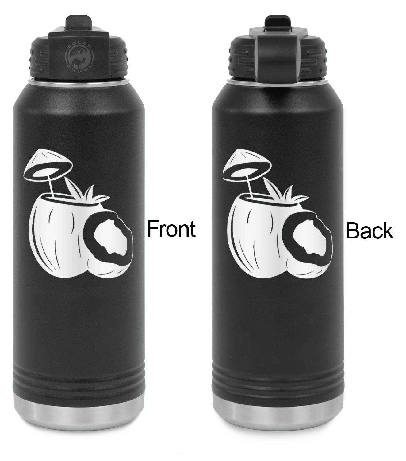 These 32 oz. water bottles are constructed from 18/8 durable food grade stainless steel. The inside of the water bottle is silver; while the outside is powder coated black