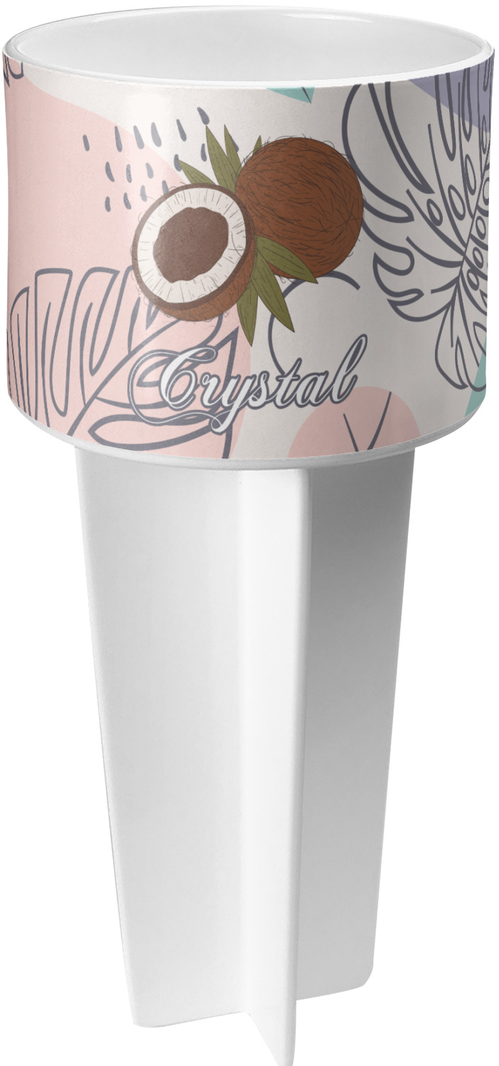 This cup holder has a large stake at its bottom that anchors it to the sand or ground below, while the cup holder rests above the stake. The entire drink holder is made of durable plastic and displays your customization around the cup holder portion. We sell these personalized beach spikers in two different colors: black and white.