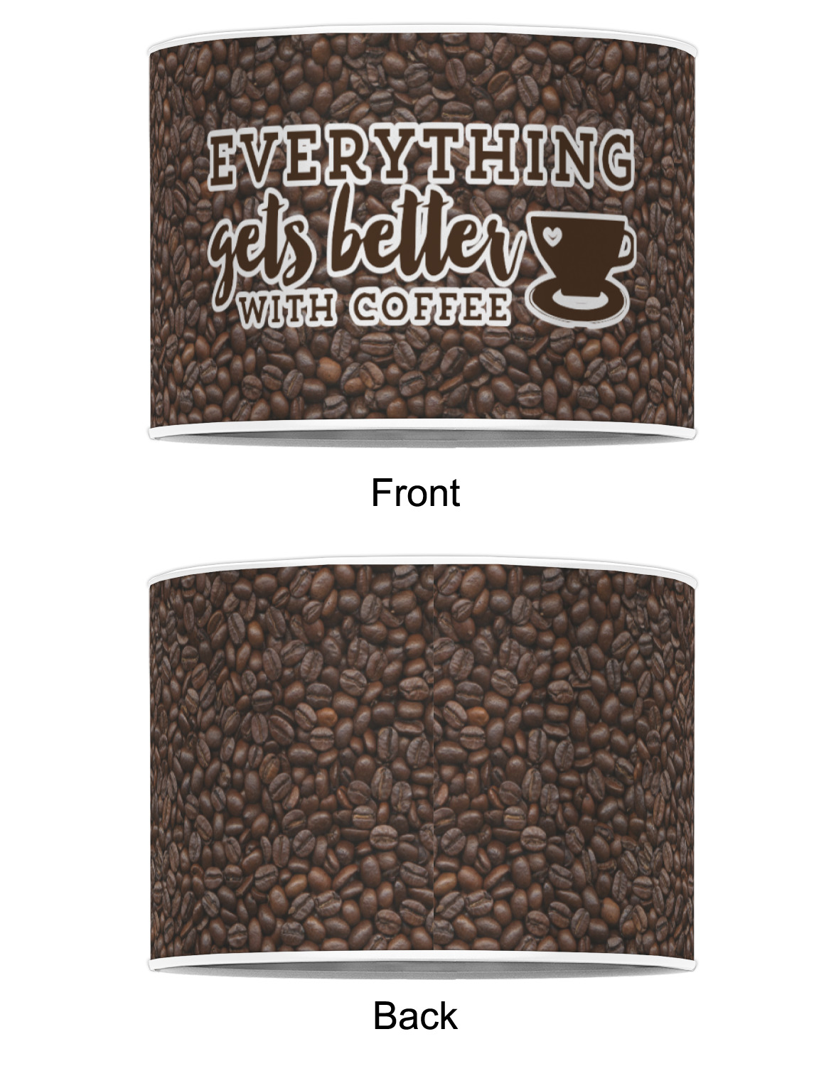 This design has a fun realistic picture of coffee beans for the background. On top of that is a fun quote saying that "everything gets better with coffee." The coordinating design has the words "coffee addict." There are also plenty of other coffee quotes to choose from in our design center.